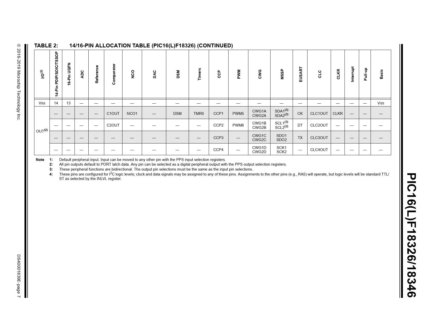 TABLE 2:. 14/16-PIN ALLOCATION TABLE (PIC16(L)F18326) (CONTINUED). O S. C/TS. ator. -up. rrupt. ADC. DAC. DSM. CCP. PWM. CLC. CLKR. Basi. -Pi. Pull