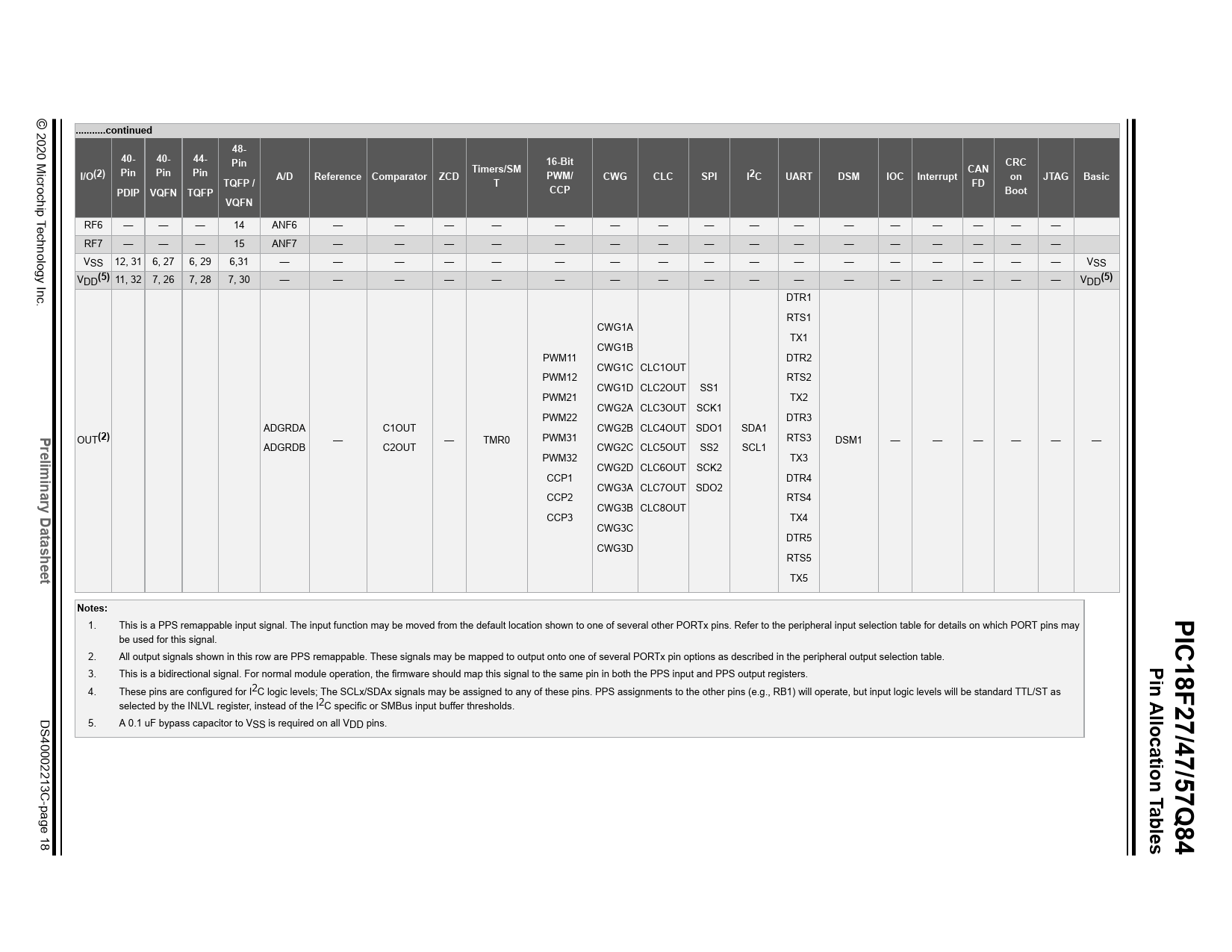 3. This is a bidirectional signal. For normal module operation, the firmware should map this signal to the same pin in both the PPS input and PPS output registers. 4. These pins are configured for I2C logic levels; The SCLx/SDAx signals may be assigned to any of these pins. PPS assignments to the other pins (e.g., RB1) will operate, but input logic levels will be standard TTL/ST as selected by the INLVL register, instead of the I2C specific or SMBus input buffer thresholds. DS40002213C-page 5. A 0.1 uF bypass capacitor to VSS is required on all VDD pins.