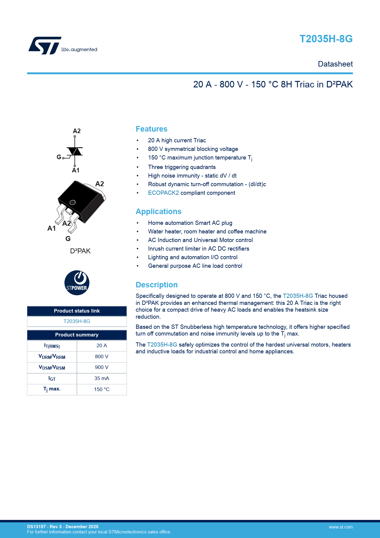 T2035H-8G. Features. Applications. Description. Product status link. Product summary. T(RMS). VDRM/VRRM. VDSM/VRSM. IGT. Tj max. DS13157. Rev 3
