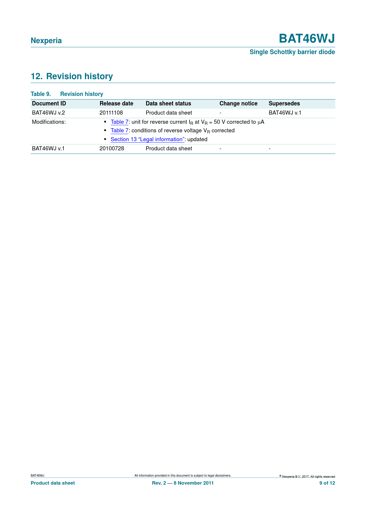 | 页数 / 页 | 12 / 9 — Nexperia. BAT46WJ. Single Schottky barrier diode. 12. Revision history. … |