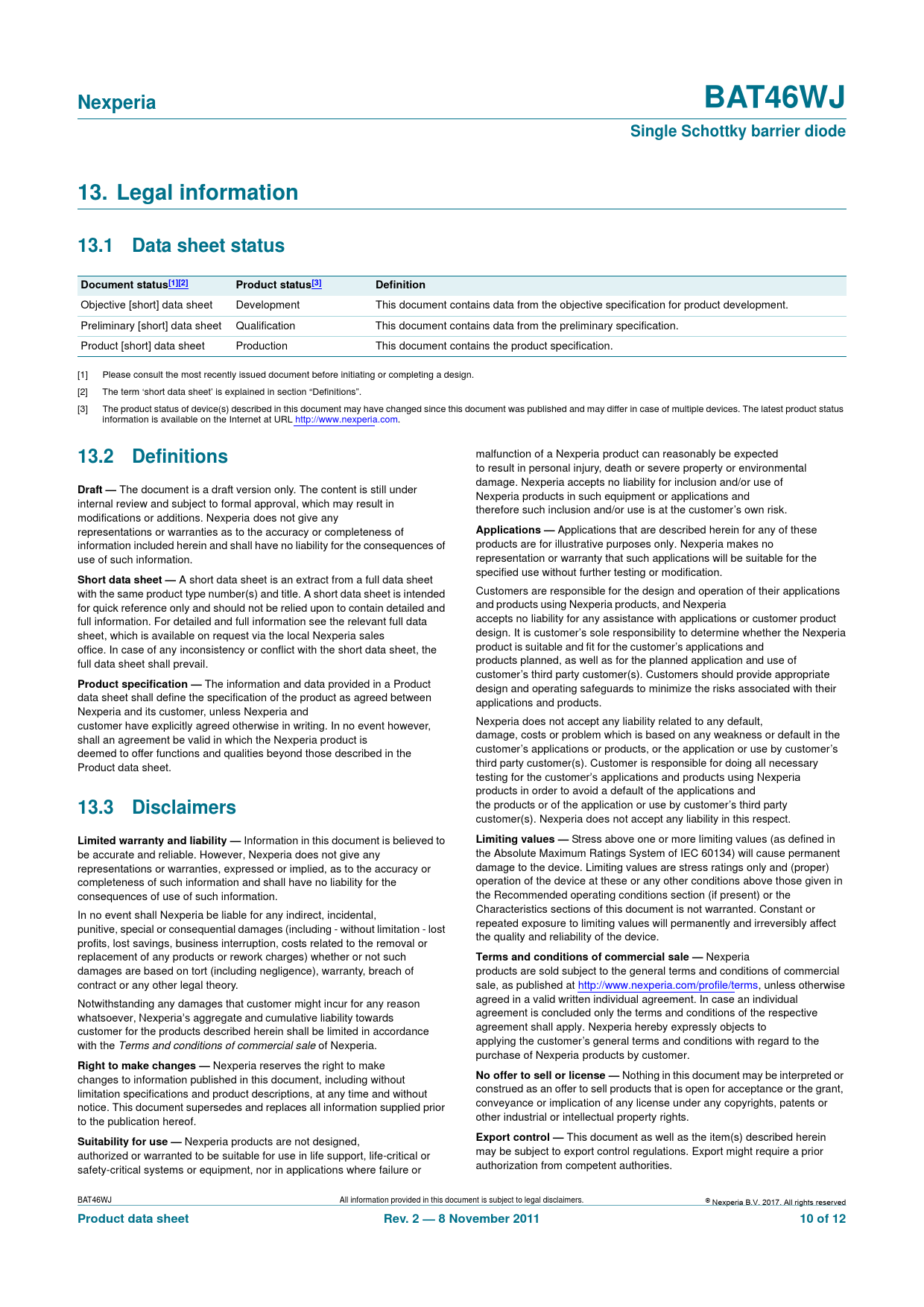 | 页数 / 页 | 12 / 10 — Nexperia. BAT46WJ. Single Schottky barrier diode. 13. Legal information. … |