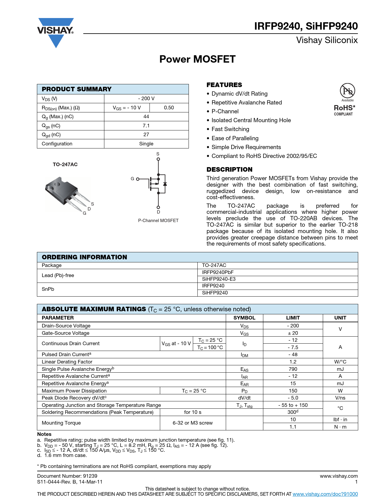 IRFP9240, SiHFP9240 Vishay Siliconix Power MOSFETFEATURESPRODUCT SUMMARY • Dynamic dV/dt Rating VDS (V) - 200 V • Repetitive Avalanche Rated Available RDS(on) (Max.) (Ω) VGS = - 10 V 0.50 RoHS* • P-Channel COMPLIANT Qg (Max.) (nC) 44 • Isolated Central Mounting Hole Qgs (nC) 7.1 • Fast Switching Qgd (nC) 27 • Ease of Paralleling Configuration Single • Simple Drive Requirements S • Compliant to RoHS Directive 2002/95/EC TO-247ACDESCRIPTION G Third generation Power MOSFETs from Vishay provide the designer with the best combination of fast switching, ruggedized device design, low on-resistance and cost-effectiveness. S The TO-247AC package is preferred for D D G commercial-industrial applications where higher power levels preclude the use of TO-220AB devices. The P-Channel MOSFET TO-247AC is similar but superior to the earlier TO-218 package because of its isolated mounting hole. It also provides greater creepage distance between pins to meet the requirements of most safety specifications. ORDERING INFORMATION Package TO-247AC IRFP9240PbF Lead (Pb)-free SiHFP9240-E3 IRFP9240 SnPb SiHFP9240 ABSOLUTE MAXIMUM RATINGS (TC = 25 °C, unless otherwise noted) PARAMETER SYMBOLLIMITUNIT Drain-Source Voltage VDS - 200 V Gate-Source Voltage VGS ± 20 T - 12 Continuous Drain Current V C = 25 °C GS at - 10 V ID T A C = 100 °C - 7.5 Pulsed Drain Currenta IDM - 48 Linear Derating Factor 1.2 W/°C Single Pulse Avalanche Energyb EAS 790 mJ Repetitive Avalanche Currenta IAR - 12 A Repetitive Avalanche Energya EAR 15 mJ Maximum Power Dissipation TC = 25 °C PD 150 W Peak Diode Recovery dV/dtc dV/dt - 5.0 V/ns Operating Junction and Storage Temperature Range TJ, Tstg - 55 to + 150 °C Soldering Recommendations (Peak Temperature) for 10 s 300d 10 lbf · in Mounting Torque 6-32 or M3 screw 1.1 N · m Notes a. Repetitive rating; pulse width limited by maximum junction temperature (see fig. 11). b. VDD = - 50 V, starting TJ = 25 °C, L = 8.2 mH, Rg = 25 Ω, IAS = - 12 A (see fig. 12). c. ISD ≤ - 12 A, dI/dt ≤ 150 A/μs, VDD ≤ VDS, TJ ≤ 150 °C. d. 1.6 mm from case. * Pb containing terminations are not RoHS compliant, exemptions may apply Document Number: 91239 www.vishay.com S11-0444-Rev. B, 14-Mar-11 1 This datasheet is subject to change without notice. THE PRODUCT DESCRIBED HEREIN AND THIS DATASHEET ARE SUBJECT TO SPECIFIC DISCLAIMERS, SET FORTH AT www.vishay.com/doc?91000