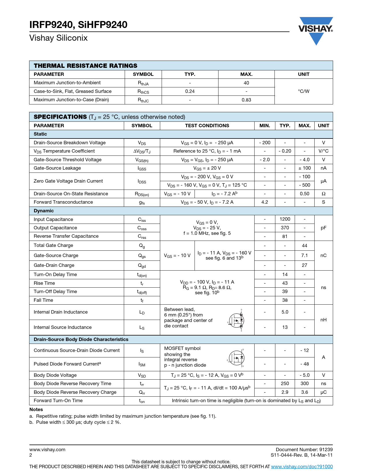 IRFP9240, SiHFP9240 Vishay Siliconix THERMAL RESISTANCE RATINGS PARAMETER SYMBOLTYP.MAX.UNIT Maximum Junction-to-Ambient RthJA - 40 Case-to-Sink, Flat, Greased Surface RthCS 0.24 - °C/W Maximum Junction-to-Case (Drain) RthJC - 0.83 SPECIFICATIONS (TJ = 25 °C, unless otherwise noted) PARAMETER SYMBOLTESTCONDITIONS MIN.TYP.MAX.UNITStatic Drain-Source Breakdown Voltage VDS VGS = 0 V, ID = - 250 μA - 200 - - V VDS Temperature Coefficient ΔVDS/TJ Reference to 25 °C, ID = - 1 mA - - 0.20 - V/°C Gate-Source Threshold Voltage VGS(th) VDS = VGS, ID = - 250 μA - 2.0 - - 4.0 V Gate-Source Leakage IGSS VGS = ± 20 V - - ± 100 nA VDS = - 200 V, VGS = 0 V - - - 100 Zero Gate Voltage Drain Current IDSS μA VDS = - 160 V, VGS = 0 V, TJ = 125 °C - - - 500 Drain-Source On-State Resistance RDS(on) VGS = - 10 V ID = - 7.2 Ab - - 0.50 Ω Forward Transconductance gfs VDS = - 50 V, ID = - 7.2 A 4.2 - - S Dynamic Input Capacitance Ciss - 1200 - VGS = 0 V, Output Capacitance Coss VDS = - 25 V, - 370 - pF f = 1.0 MHz, see fig. 5 Reverse Transfer Capacitance Crss - 81 - Total Gate Charge Qg - - 44 I Gate-Source Charge Qgs V D = - 11 A, VDS = - 160 V GS = - 10 V - - 7.1 nC see fig. 6 and 13b Gate-Drain Charge Qgd - - 27 Turn-On Delay Time td(on) - 14 - V Rise Time t DD = - 100 V, ID = - 11 A r - 43 - RG = 9.1 Ω, RD= 8.6 Ω, ns Turn-Off Delay Time td(off) see fig. 10b - 39 - Fall Time tf - 38 - Between lead, D Internal Drain Inductance LD - 5.0 - 6 mm (0.25") from package and center of nH G die contact Internal Source Inductance LS - 13 - S Drain-Source Body Diode Characteristics Continuous Source-Drain Diode Current I MOSFET symbol D S - - - 12 showing the A integral reverse G Pulsed Diode Forward Currenta ISM p - n junction diode - - - 48 S Body Diode Voltage VSD TJ = 25 °C, IS = - 12 A, VGS = 0 Vb - - - 5.0 V Body Diode Reverse Recovery Time trr - 250 300 ns TJ = 25 °C, IF = - 11 A, dI/dt = 100 A/μsb Body Diode Reverse Recovery Charge Qrr - 2.9 3.6 μC Forward Turn-On Time ton Intrinsic turn-on time is negligible (turn-on is dominated by LS and LD) Notes a. Repetitive rating; pulse width limited by maximum junction temperature (see fig. 11). b. Pulse width ≤ 300 μs; duty cycle ≤ 2 %. www.vishay.com Document Number: 91239 2 S11-0444-Rev. B, 14-Mar-11 This datasheet is subject to change without notice. THE PRODUCT DESCRIBED HEREIN AND THIS DATASHEET ARE SUBJECT TO SPECIFIC DISCLAIMERS, SET FORTH AT www.vishay.com/doc?91000