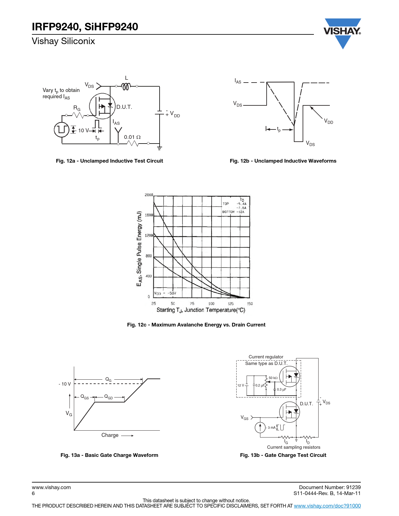 IRFP9240, SiHFP9240 Vishay Siliconix L I V AS DS Vary tp to obtain required IAS VDS R D.U.T. G -+ VDD I V AS DD - 10 V tp t 0.01 p Ω VDS Fig. 12a - Unclamped Inductive Test CircuitFig. 12b - Unclamped Inductive WaveformsFig. 12c - Maximum Avalanche Energy vs. Drain Current Current regulator Same type as D.U.T. Q 50 kΩ G - 10 V 12 V 0.2 µF 0.3 µF Q Q - GS GD + V D.U.T. DS VG VGS - 3 mA Charge I I G D Current sampling resistors Fig. 13a - Basic Gate Charge WaveformFig. 13b - Gate Charge Test Circuit www.vishay.com Document Number: 91239 6 S11-0444-Rev. B, 14-Mar-11 This datasheet is subject to change without notice. THE PRODUCT DESCRIBED HEREIN AND THIS DATASHEET ARE SUBJECT TO SPECIFIC DISCLAIMERS, SET FORTH AT www.vishay.com/doc?91000