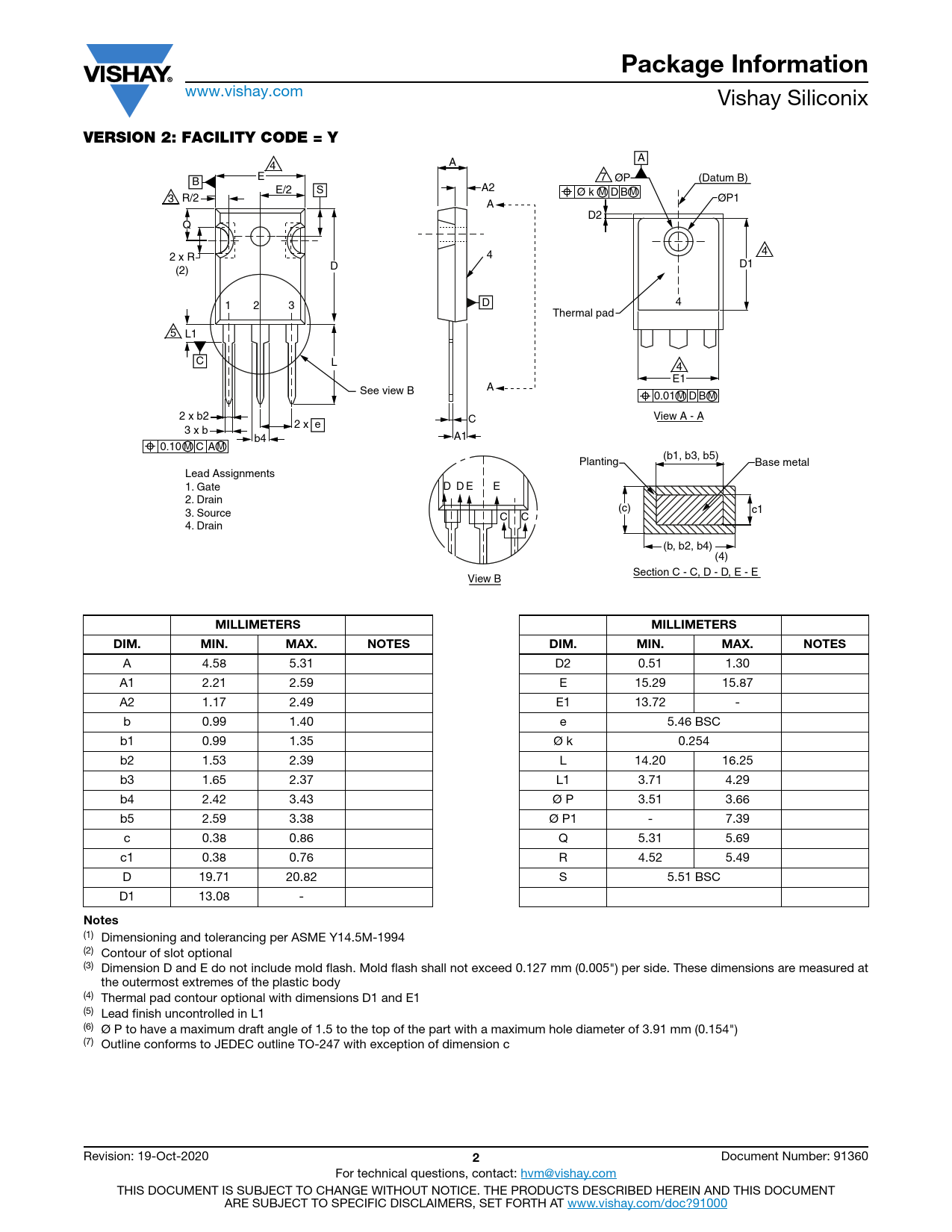 Package Information www.vishay.com Vishay Siliconix VERSION 2: FACILITY CODE = Y A A 4 E B 7 ØP (Datum B) E/2 S A2 Ø k M D B M R/2 3 ØP1 A D2 Q 4 2 x R 4 D1 (2) D 1 2 3 D 4 Thermal pad L1 5 C L 4 E1 See view B A 0.01 M D B M 2 x b2 C View A - A 2 x e 3 x b b4 A1 0.10 M C A M (b1, b3, b5) Planting Base metal Lead Assignments 1. Gate D D E E 2. Drain (c) c1 3. Source C C 4. Drain (b, b2, b4) (4) Section C - C, D - D, E - E View B MILLIMETERSMILLIMETERSDIM.MIN.MAX.NOTESDIM.MIN.MAX.NOTES A 4.58 5.31 D2 0.51 1.30 A1 2.21 2.59 E 15.29 15.87 A2 1.17 2.49 E1 13.72 - b 0.99 1.40 e 5.46 BSC b1 0.99 1.35 Ø k 0.254 b2 1.53 2.39 L 14.20 16.25 b3 1.65 2.37 L1 3.71 4.29 b4 2.42 3.43 Ø P 3.51 3.66 b5 2.59 3.38 Ø P1 - 7.39 c 0.38 0.86 Q 5.31 5.69 c1 0.38 0.76 R 4.52 5.49 D 19.71 20.82 S 5.51 BSC D1 13.08 - Notes (1) Dimensioning and tolerancing per ASME Y14.5M-1994 (2) Contour of slot optional (3) Dimension D and E do not include mold flash. Mold flash shall not exceed 0.127 mm (0.005") per side. These dimensions are measured at the outermost extremes of the plastic body (4) Thermal pad contour optional with dimensions D1 and E1 (5) Lead finish uncontrolled in L1 (6) Ø P to have a maximum draft angle of 1.5 to the top of the part with a maximum hole diameter of 3.91 mm (0.154") (7) Outline conforms to JEDEC outline TO-247 with exception of dimension c Revision: 19-Oct-2020 2 Document Number: 91360 For technical questions, contact: hvm@vishay.com THIS DOCUMENT IS SUBJECT TO CHANGE WITHOUT NOTICE. THE PRODUCTS DESCRIBED HEREIN AND THIS DOCUMENT ARE SUBJECT TO SPECIFIC DISCLAIMERS, SET FORTH AT www.vishay.com/doc?91000