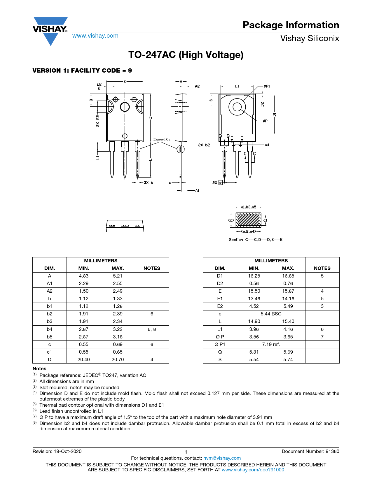 Package Information www.vishay.com Vishay Siliconix TO-247AC (High Voltage)VERSION 1: FACILITY CODE = 9MILLIMETERSMILLIMETERSDIM.MIN.MAX.NOTESDIM.MIN.MAX.NOTES A 4.83 5.21 D1 16.25 16.85 5 A1 2.29 2.55 D2 0.56 0.76 A2 1.50 2.49 E 15.50 15.87 4 b 1.12 1.33 E1 13.46 14.16 5 b1 1.12 1.28 E2 4.52 5.49 3 b2 1.91 2.39 6 e 5.44 BSC b3 1.91 2.34 L 14.90 15.40 b4 2.87 3.22 6, 8 L1 3.96 4.16 6 b5 2.87 3.18 Ø P 3.56 3.65 7 c 0.55 0.69 6 Ø P1 7.19 ref. c1 0.55 0.65 Q 5.31 5.69 D 20.40 20.70 4 S 5.54 5.74 Notes (1) Package reference: JEDEC® TO247, variation AC (2) All dimensions are in mm (3) Slot required, notch may be rounded (4) Dimension D and E do not include mold flash. Mold flash shall not exceed 0.127 mm per side. These dimensions are measured at the outermost extremes of the plastic body (5) Thermal pad contour optional with dimensions D1 and E1 (6) Lead finish uncontrolled in L1 (7) Ø P to have a maximum draft angle of 1.5° to the top of the part with a maximum hole diameter of 3.91 mm (8) Dimension b2 and b4 does not include dambar protrusion. Allowable dambar protrusion shall be 0.1 mm total in excess of b2 and b4 dimension at maximum material condition Revision: 19-Oct-2020 1 Document Number: 91360 For technical questions, contact: hvm@vishay.com THIS DOCUMENT IS SUBJECT TO CHANGE WITHOUT NOTICE. THE PRODUCTS DESCRIBED HEREIN AND THIS DOCUMENT ARE SUBJECT TO SPECIFIC DISCLAIMERS, SET FORTH AT www.vishay.com/doc?91000