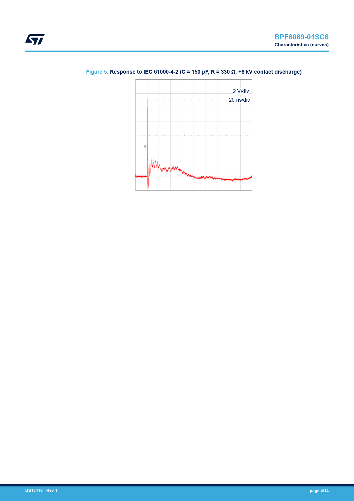 BPF8089-01SC6 Characteristics (curves) Figure 5. Response to IEC 61000-4-2 (C = 150 pF, R = 330 Ω, +8 kV contact discharge) DS13416