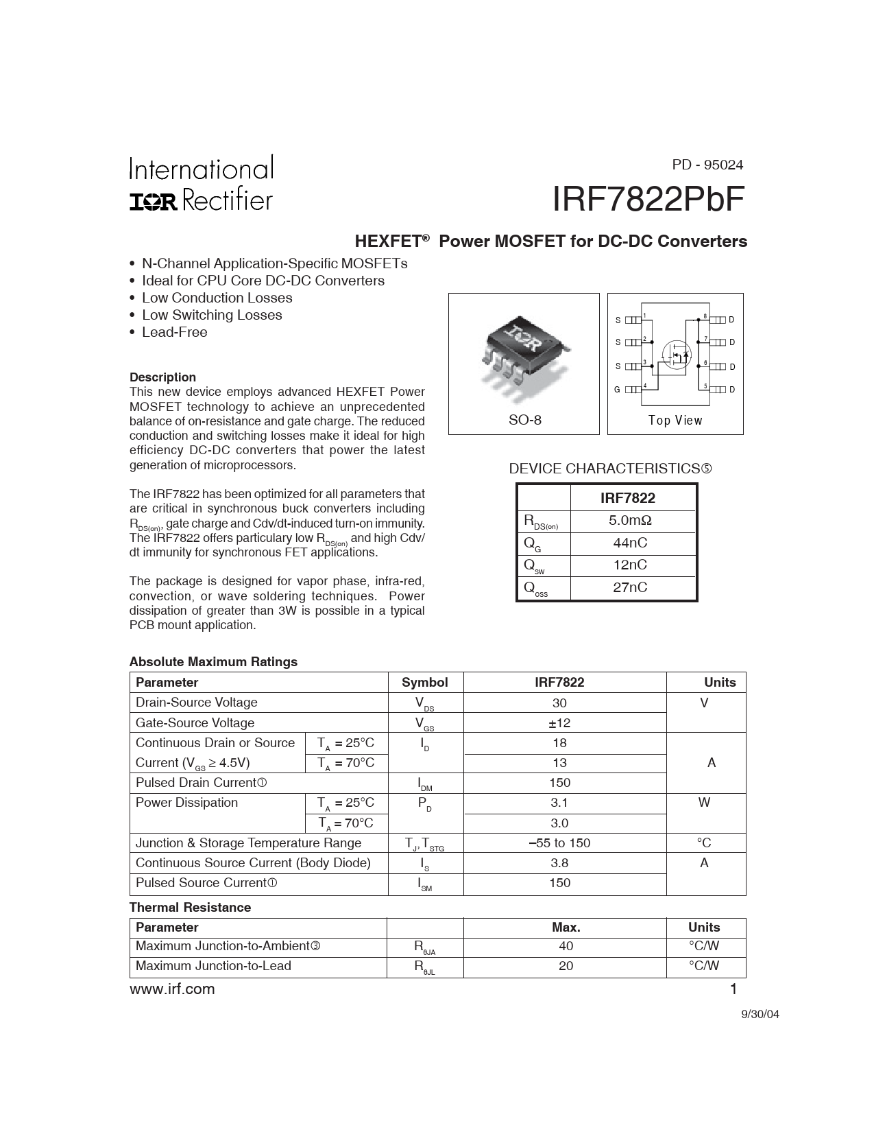 PD - 95024 IRF7822PbF HEXFET® Power MOSFET for DC-DC Converters • N-Channel Application-Specific MOSFETs • Ideal for CPU Core DC-DC Converters • Low Conduction Losses A 1 • Low Switching Losses 8 S D • Lead-Free 2 7 S D 3 6 S D Description 4 5 G D This new device employs advanced HEXFET Power MOSFET technology to achieve an unprecedented balance of on-resistance and gate charge. The reduced SO-8 T op V iew conduction and switching losses make it ideal for high efficiency DC-DC converters that power the latest generation of microprocessors. DEVICE CHARACTERISTICS The IRF7822 has been optimized for all parameters that IRF7822 are critical in synchronous buck converters including R , gate charge and Cdv/dt-induced turn-on immunity. R 5.0mΩ DS(on) DS(on) The IRF7822 offers particulary low R and high Cdv/ DS(on) Q 44nC G dt immunity for synchronous FET applications. Q 12nC sw The package is designed for vapor phase, infra-red, Q 27nC oss convection, or wave soldering techniques. Power dissipation of greater than 3W is possible in a typical PCB mount application. Absolute Maximum RatingsParameterSymbolIRF7822Units Drain-Source Voltage V 30 V DS Gate-Source Voltage V ±12 GS Continuous Drain or Source T = 25°C I 18 A D Current (V ≥ 4.5V) T = 70°C 13 A GS A Pulsed Drain Current I 150 DM Power Dissipation T = 25°C P 3.1 W A D T = 70°C 3.0 A Junction & Storage Temperature Range T ,T –55 to 150 °C J STG Continuous Source Current (Body Diode) I 3.8 A S Pulsed Source Current I 150 SM Thermal ResistanceParameterMax.Units Maximum Junction-to-Ambient R 40 °C/W θJA Maximum Junction-to-Lead R 20 °C/W θJL www.irf.com 1 9/30/04
