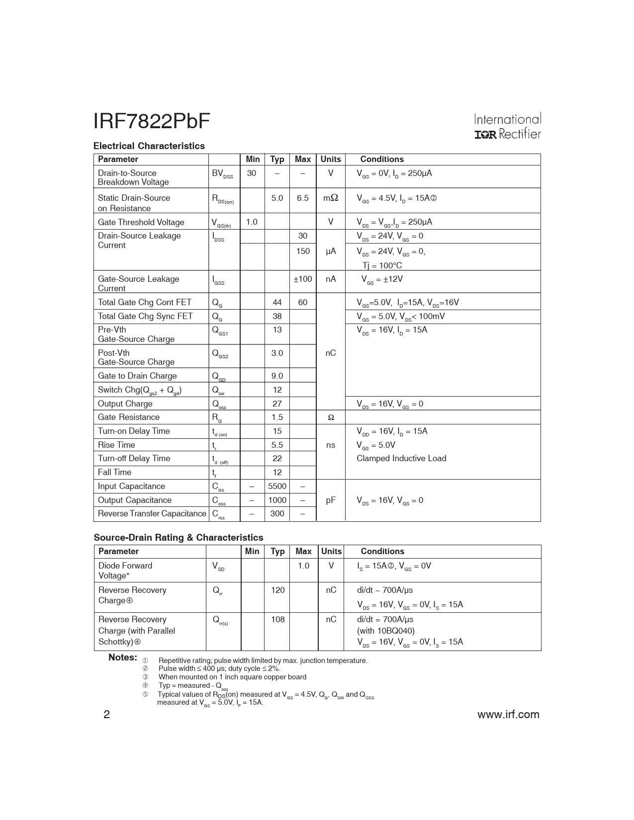 Electrical Characteristics. Parameter. Min. Typ. Max Units. Conditions. Source-Drain Rating & Characteristics. Notes: