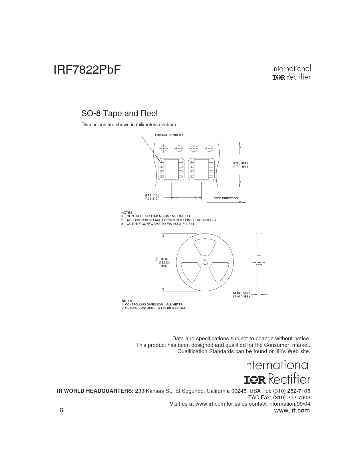 IRF7822PbF SO-8 Tape and Reel Dimensions are shown in milimeters (inches) TERMINAL NUMBER 1 12.3 ( .484 ) 11.7 ( .461 ) 8.1 ( .318 ) 7.9 ( .312 ) FEED DIRECTION NOTES: 1. CONTROLLING DIMENSION : MILLIMETER. 2. ALL DIMENSIONS ARE SHOWN IN MILLIMETERS(INCHES). 3. OUTLINE CONFORMS TO EIA-481 & EIA-541. 330.00 (12.992) MAX. 14.40 ( .566 ) 12.40 ( .488 ) NOTES : 1. CONTROLLING DIMENSION : MILLIMETER. 2. OUTLINE CONFORMS TO EIA-481 & EIA-541. Data and specifications subject to change without notice. This product has been designed and qualified for the Consumer market. Qualification Standards can be found on IR’s Web site. IR WORLD HEADQUARTERS: 233 Kansas St., El Segundo, California 90245, USA Tel: (310) 252-7105 TAC Fax: (310) 252-7903 Visit us at www.irf.com for sales contact information . 09/04 6 www.irf.com