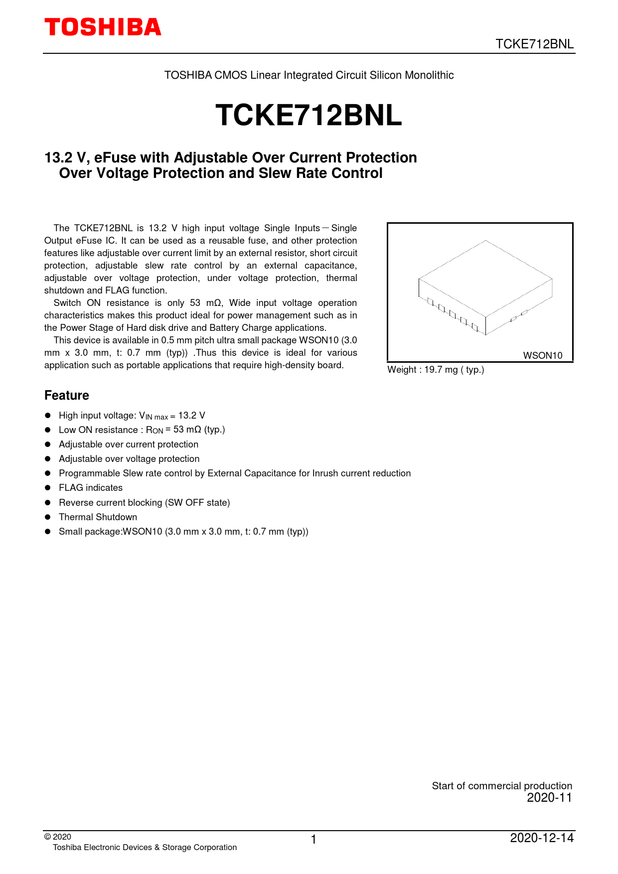 High input voltage: VIN max = 13.2 V Low ON resistance : RON = 53 mΩ (typ.) Adjustable over current protection Adjustable over voltage protection Programmable Slew rate control by External Capacitance for Inrush current reduction FLAG indicates Reverse current blocking (SW OFF state) Thermal Shutdown Small package:WSON10 (3.0 mm x 3.0 mm, t: 0.7 mm (typ)) Start of commercial production 2020-11 © 2020 1 2020-12-14 Toshiba Electronic Devices & Storage Corporation