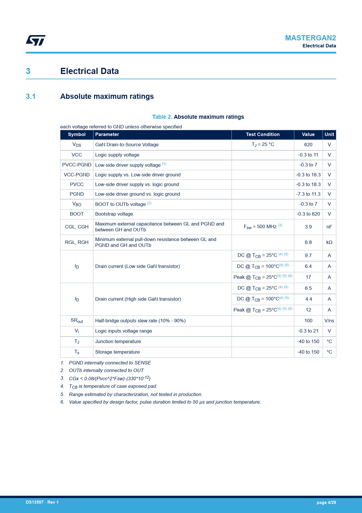 页数 / 页29 / 4 — MASTERGAN2. Electrical Data. 3.1. Absolute maximum ratings. Table 2. …