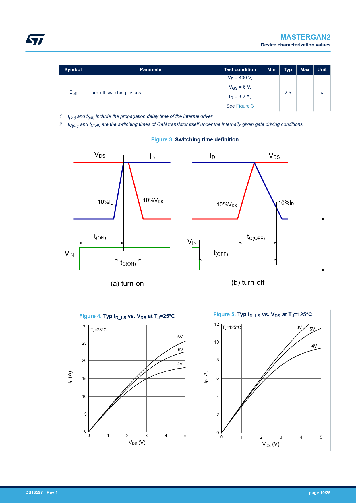 link to page 10 MASTERGAN2Device characterization valuesSymbolParameterTest conditionMinTypMaxUnit VS = 400 V, VGS = 6 V, Eoff Turn-off switching losses 2.5 µJ ID = 3.2 A, See Figure 3 1. t(on) and t(off) include the propagation delay time of the internal driver 2. tC(on) and tC(off) are the switching times of GaN transistor itself under the internally given gate driving conditions Figure 3. Switching time definition VDS ID ID VDS 10%I 10%V D DS 10%ID 10%VDS t(ON) t V C(OFF) IN V t IN (OFF) tC(ON) (a) turn-on (b) turn-off Figure 4. Typ IFigure 5. Typ ID_LS vs. VDS at TJ=25°CD_LS vs. VDS at TJ=125°C 30 12 T 6V T J=125°C 5V J=25°C 6V 25 10 4V 5V 20 8 4V (A) 15 (A) 6 I D I D 10 4 5 2 0 0 0 1 2 3 4 5 0 1 2 3 4 5 VDS (V) VDS (V) DS13597 - Rev 1page 10/29 Document Outline Features Application Description 1 Block diagram 2 Pin description and connection diagram 2.1 Pin list 3 Electrical Data 3.1 Absolute maximum ratings 3.2 Recommended operating conditions 3.3 Thermal data 4 Electrical characteristics 4.1 Driver 4.2 GaN power transistor 5 Device characterization values 6 Functional description 6.1 Logic inputs 6.2 Bootstrap structure 6.3 VCC supply pins and UVLO function 6.4 VBO UVLO protection 6.5 Thermal shutdown 7 Typical application diagrams 8 Package information 8.1 QFN 9 x 9 x 1 mm, 31 leads, pitch 0.6 mm package information 9 Suggested footprint 10 Ordering information Revision history Contents List of tables List of figures