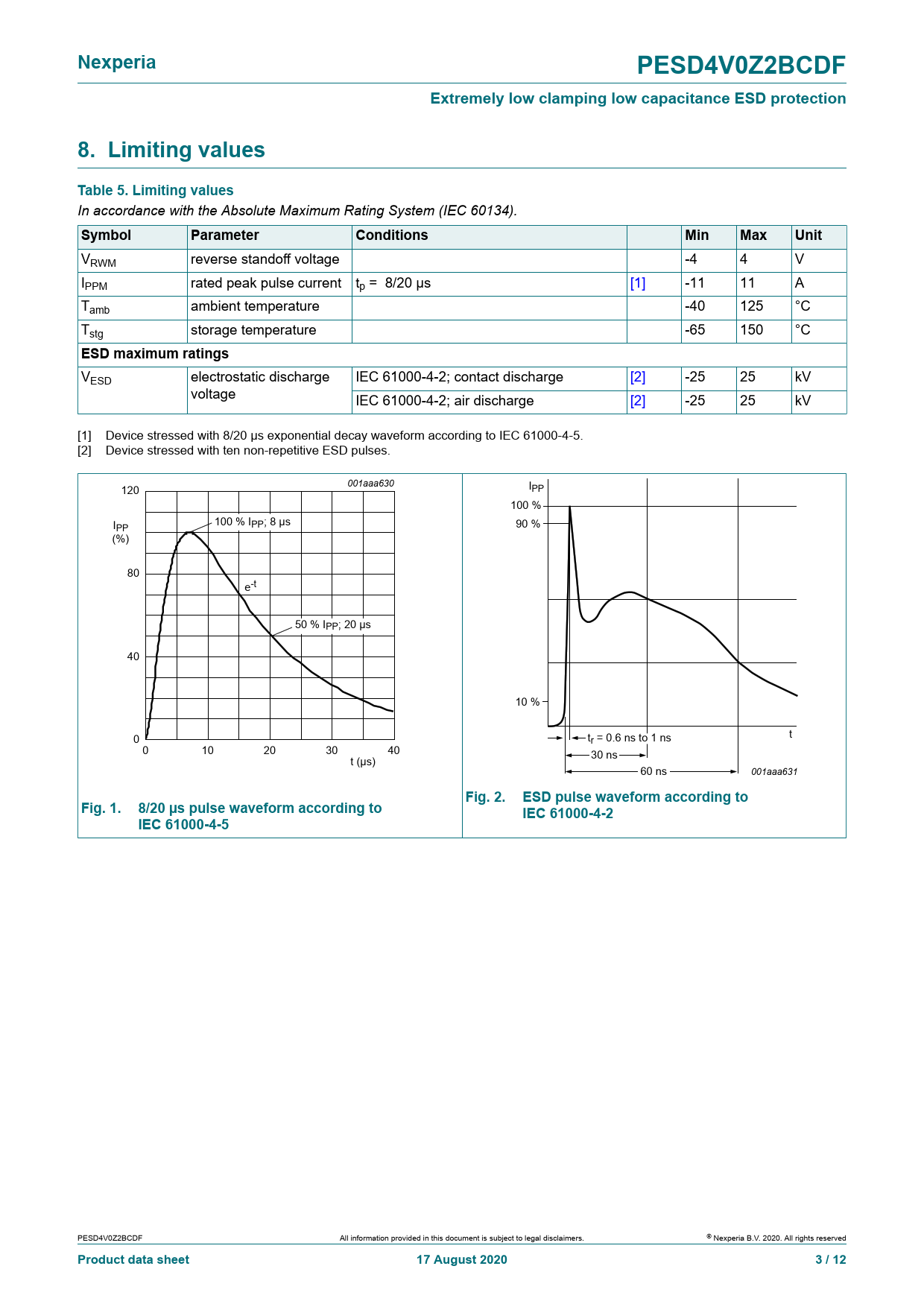 Nexperia. PESD4V0Z2BCDF. Extremely low clamping low capacitance ESD protection. 8. Limiting values Table 5. Limiting values
