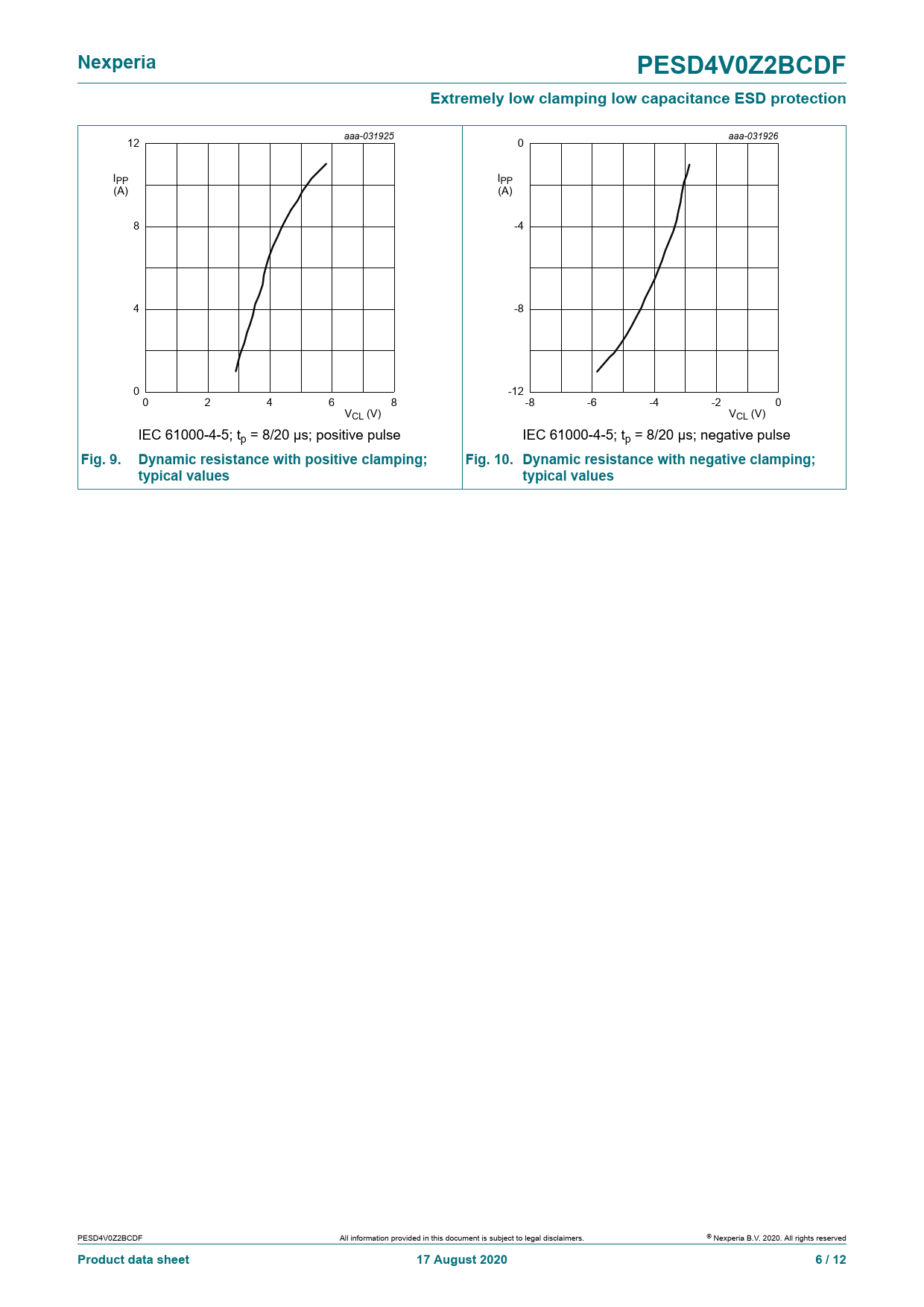aaa-031925 12 aaa-031926 0 IPP IPP (A) (A) 8 -4 4 -8 0 -12 0 2 4 6 8 -8 -6 -4 -2 0 VCL (V) VCL (V) IEC 61000-4-5; tp = 8/20 μs; positive pulse IEC 61000-4-5; tp = 8/20 μs; negative pulse