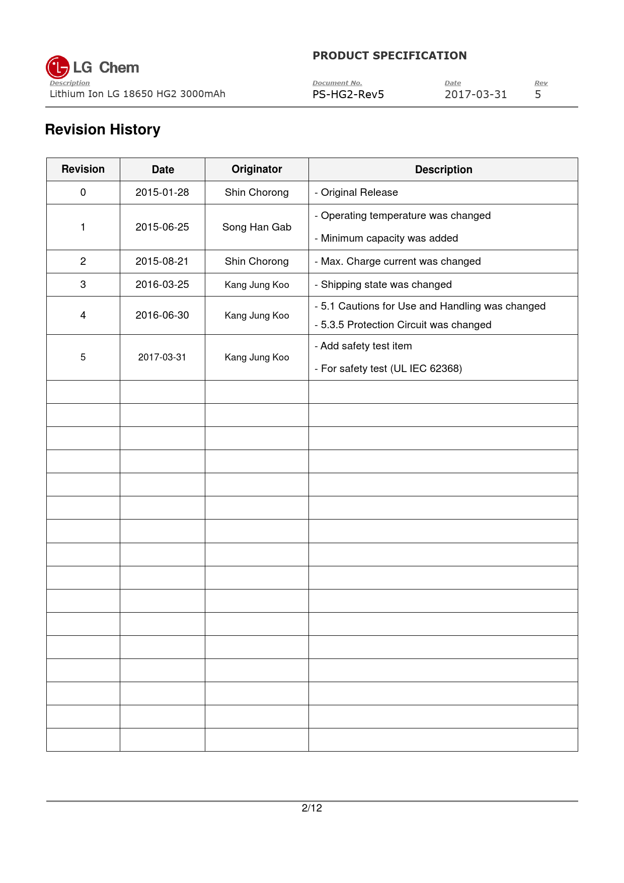 0 2015-01-28 Shin Chorong - Original Release - Operating temperature was changed 1 2015-06-25 Song Han Gab - Minimum capacity was added 2 2015-08-21 Shin Chorong - Max. Charge current was changed 3 2016-03-25 Kang Jung Koo - Shipping state was changed - 5.1 Cautions for Use and Handling was changed 4 2016-06-30 Kang Jung Koo - 5.3.5 Protection Circuit was changed - Add safety test item 5 2017-03-31 Kang Jung Koo - For safety test (UL IEC 62368) 2/12