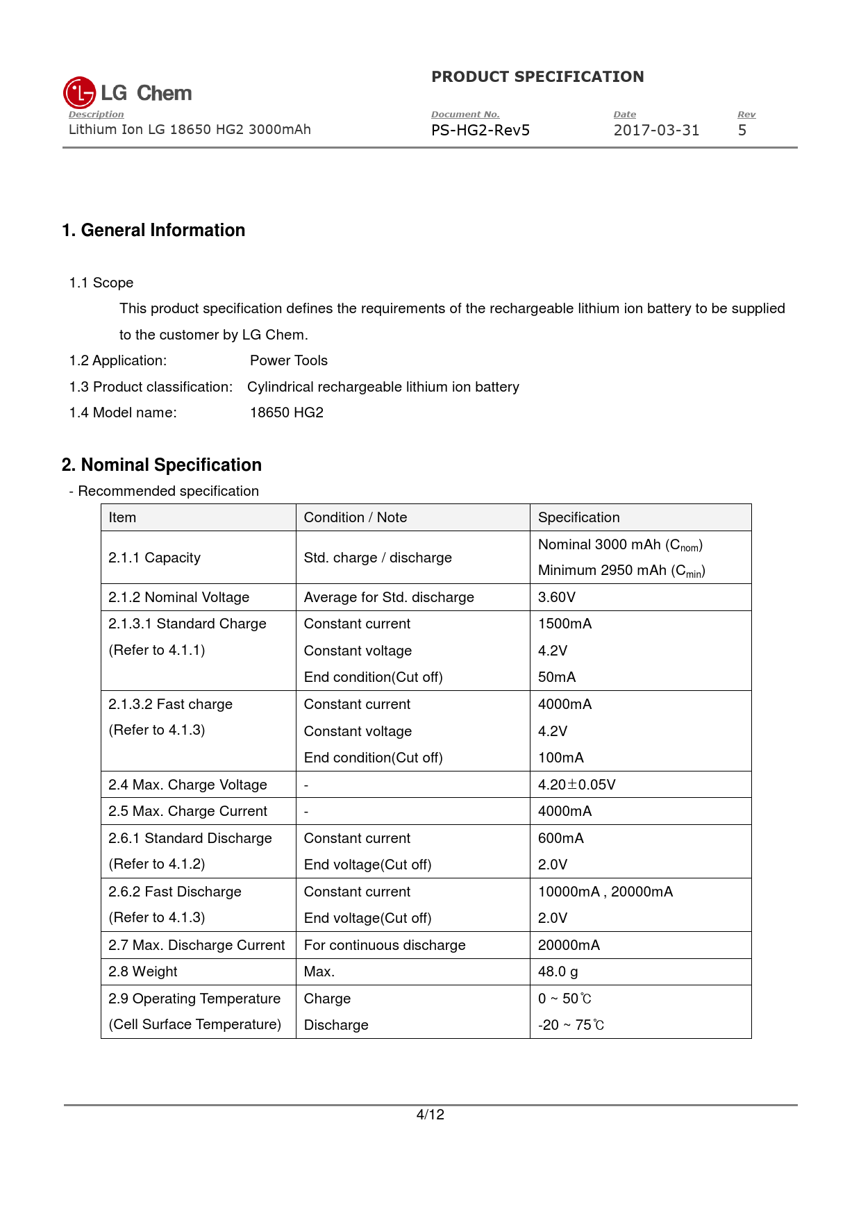 1.1 Scope This product specification defines the requirements of the rechargeable lithium ion battery to be supplied to the customer by LG Chem. 1.2 Application: Power Tools 1.3 Product classification: Cylindrical rechargeable lithium ion battery 1.4 Model name: 18650 HG2
