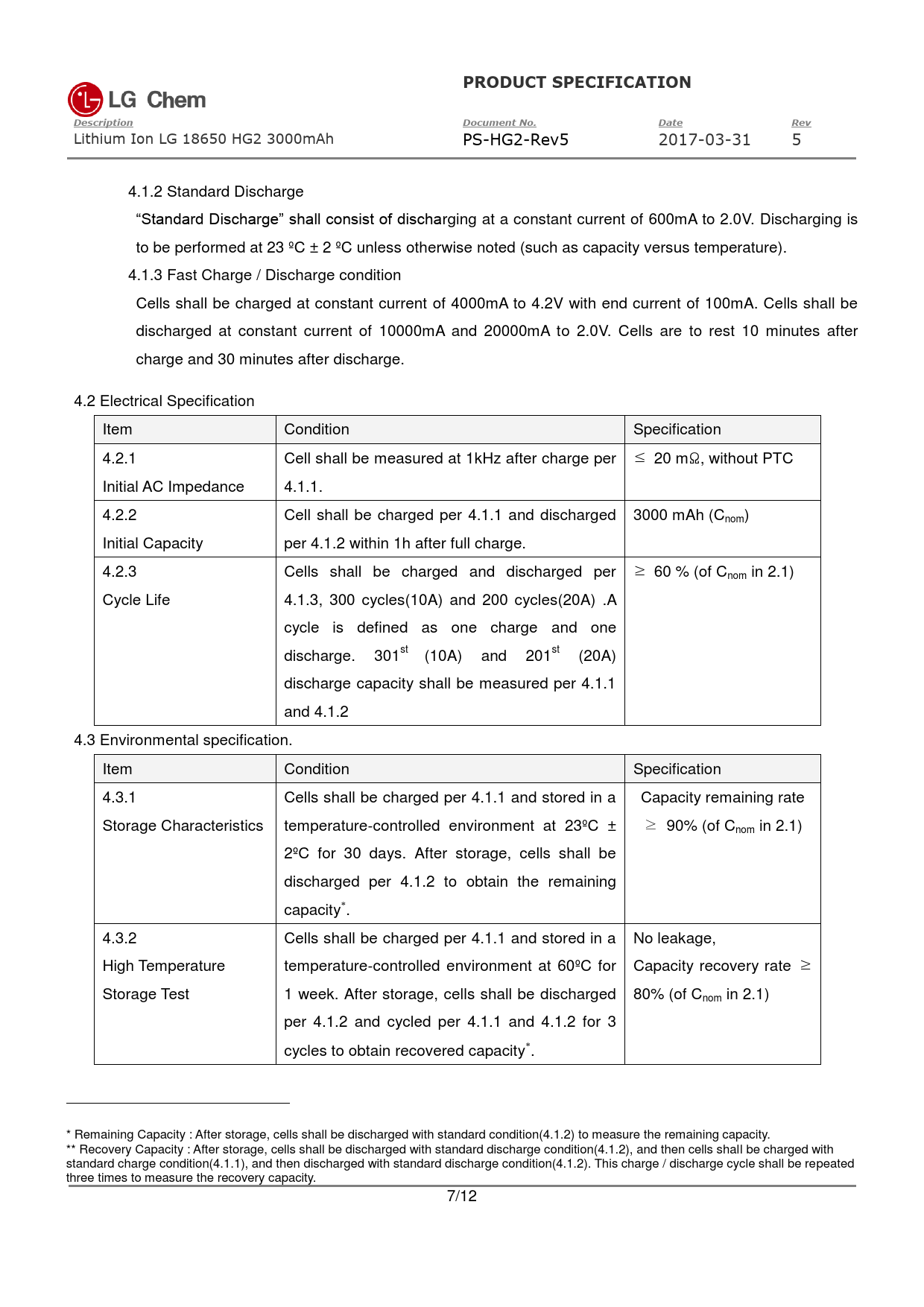 Lithium Ion LG 18650 HG2 3000mAh PS-HG2-Rev5 2017-03-31 5 4.1.2 Standard Discharge “Standard Discharge” shal consist of discharging at a constant current of 600mA to 2.0V. Discharging is to be performed at 23 ºC ± 2 ºC unless otherwise noted (such as capacity versus temperature). 4.1.3 Fast Charge / Discharge condition Cells shall be charged at constant current of 4000mA to 4.2V with end current of 100mA. Cells shall be discharged at constant current of 10000mA and 20000mA to 2.0V. Cells are to rest 10 minutes after charge and 30 minutes after discharge. 4.2 Electrical Specification Item Condition Specification 4.2.1 Cell shall be measured at 1kHz after charge per ≤ 20 mΩ, without PTC Initial AC Impedance 4.1.1. 4.2.2 Cell shall be charged per 4.1.1 and discharged 3000 mAh (Cnom) Initial Capacity per 4.1.2 within 1h after full charge. 4.2.3 Cells shall be charged and discharged per ≥ 60 % (of Cnom in 2.1) Cycle Life 4.1.3, 300 cycles(10A) and 200 cycles(20A) .A cycle is defined as one charge and one discharge. 301st (10A) and 201st (20A) discharge capacity shall be measured per 4.1.1 and 4.1.2 4.3 Environmental specification. Item Condition Specification 4.3.1 Cells shall be charged per 4.1.1 and stored in a Capacity remaining rate Storage Characteristics temperature-controlled environment at 23ºC ± ≥ 90% (of Cnom in 2.1) 2ºC for 30 days. After storage, cells shall be discharged per 4.1.2 to obtain the remaining capacity. 4.3.2 Cells shall be charged per 4.1.1 and stored in a No leakage, High Temperature temperature-controlled environment at 60ºC for Capacity recovery rate ≥ Storage Test 1 week. After storage, cells shall be discharged 80% (of Cnom in 2.1) per 4.1.2 and cycled per 4.1.1 and 4.1.2 for 3 cycles to obtain recovered capacity. * Remaining Capacity : After storage, cells shall be discharged with standard condition(4.1.2) to measure the remaining capacity. ** Recovery Capacity : After storage, cells shall be discharged with standard discharge condition(4.1.2), and then cells shall be charged with standard charge condition(4.1.1), and then discharged with standard discharge condition(4.1.2). This charge / discharge cycle shall be repeated three times to measure the recovery capacity. 7/12