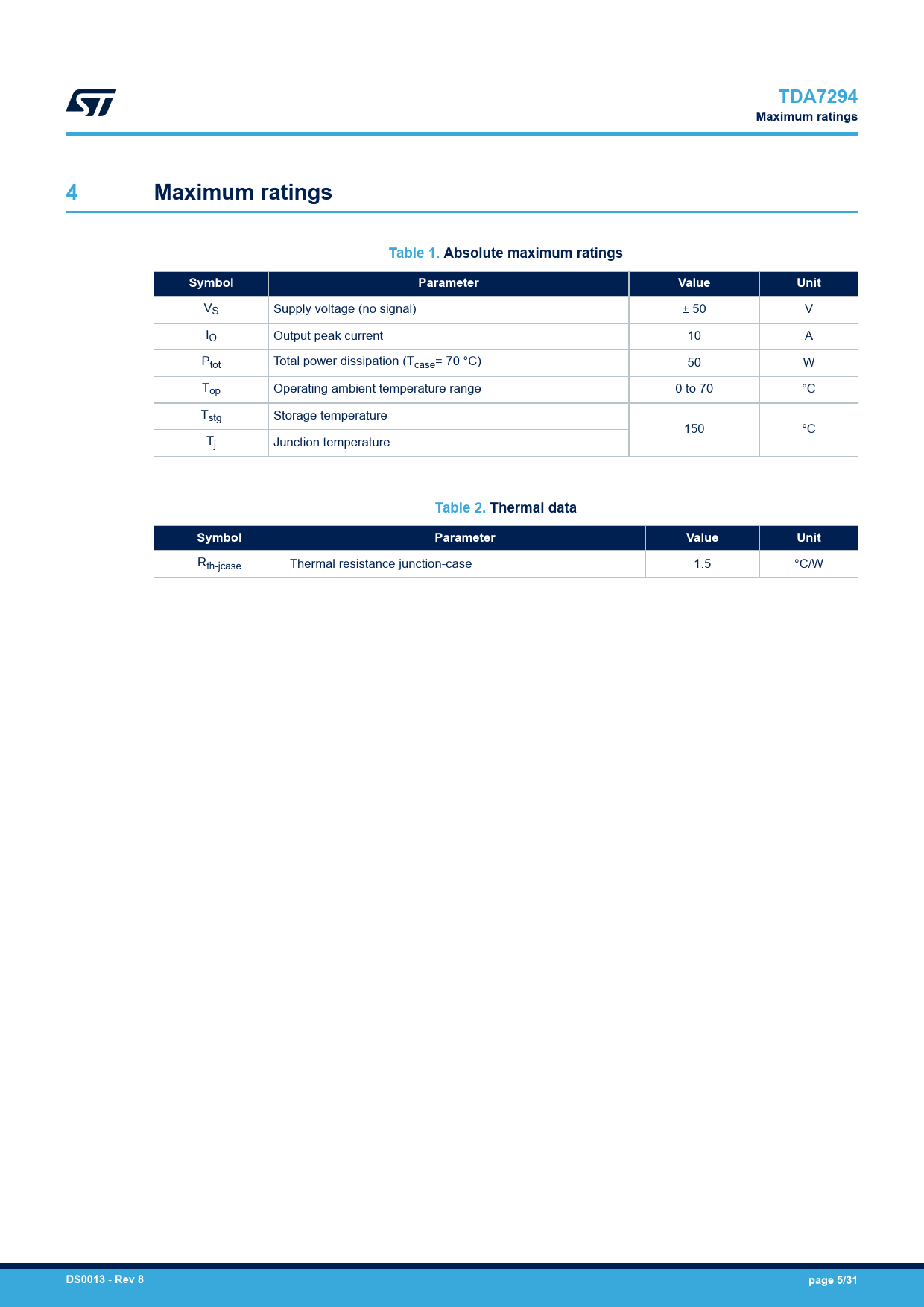 TDA7294. Maximum ratings. Table 1. Absolute maximum ratings. Symbol. Parameter. Value. Unit. Table 2. Thermal data. DS0013. Rev 8