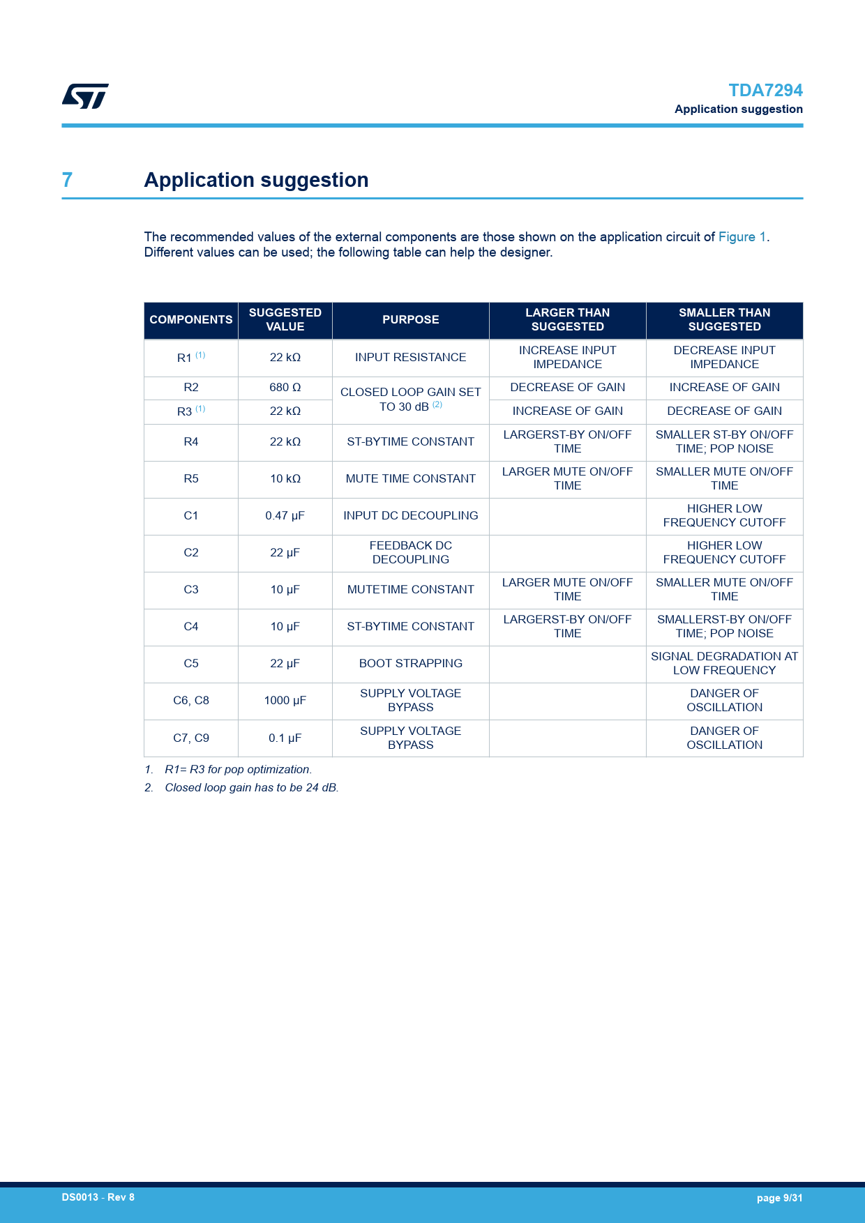 link to page 2 link to page 9 link to page 9 link to page 9 TDA7294Application suggestion7Application suggestion The recommended values of the external components are those shown on the application circuit of Figure 1. Different values can be used; the following table can help the designer. SUGGESTEDLARGER THANSMALLER THANCOMPONENTSPURPOSEVALUESUGGESTEDSUGGESTED INCREASE INPUT DECREASE INPUT R1 (1) 22 kΩ INPUT RESISTANCE IMPEDANCE IMPEDANCE R2 680 Ω CLOSED LOOP GAIN SET DECREASE OF GAIN INCREASE OF GAIN TO 30 dB (2) R3 (1) 22 kΩ INCREASE OF GAIN DECREASE OF GAIN LARGERST-BY ON/OFF SMALLER ST-BY ON/OFF R4 22 kΩ ST-BYTIME CONSTANT TIME TIME; POP NOISE LARGER MUTE ON/OFF SMALLER MUTE ON/OFF R5 10 kΩ MUTE TIME CONSTANT TIME TIME HIGHER LOW C1 0.47 μF INPUT DC DECOUPLING FREQUENCY CUTOFF FEEDBACK DC HIGHER LOW C2 22 μF DECOUPLING FREQUENCY CUTOFF LARGER MUTE ON/OFF SMALLER MUTE ON/OFF C3 10 μF MUTETIME CONSTANT TIME TIME LARGERST-BY ON/OFF SMALLERST-BY ON/OFF C4 10 μF ST-BYTIME CONSTANT TIME TIME; POP NOISE SIGNAL DEGRADATION AT C5 22 μF BOOT STRAPPING LOW FREQUENCY SUPPLY VOLTAGE DANGER OF C6, C8 1000 μF BYPASS OSCILLATION SUPPLY VOLTAGE DANGER OF C7, C9 0.1 μF BYPASS OSCILLATION 1. R1= R3 for pop optimization. 2. Closed loop gain has to be 24 dB. DS0013 - Rev 8page 9/31 Document Outline Features Description 1 Typical application 2 Pin connection 3 Block diagram 4 Maximum ratings 5 Electrical characteristics 6 PCB and components 7 Application suggestion 8 Typical characteristics 9 Introduction 9.1 Output stage 9.2 Protections 9.3 Other features 10 Application information 11 Bridge application 12 Package information 12.1 Multiwatt15 V package information 12.2 Multiwatt15 H package information Revision history