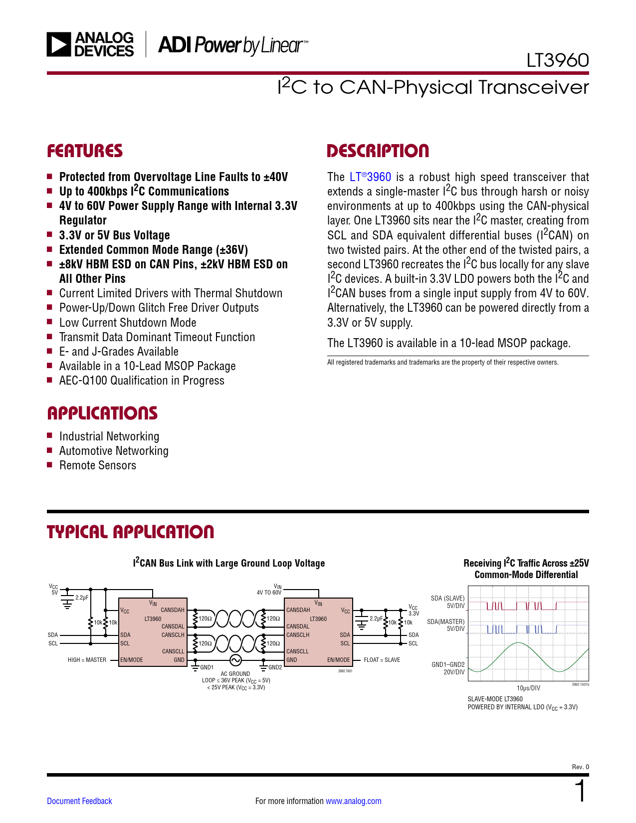 I2C devices. A built-in 3.3V LDO powers both the I2C and n Current Limited Drivers with Thermal Shutdown I2CAN buses from a single input supply from 4V to 60V. n Power-Up/Down Glitch Free Driver Outputs Alternatively, the LT3960 can be powered directly from a n Low Current Shutdown Mode 3.3V or 5V supply. n Transmit Data Dominant Timeout Function The LT3960 is available in a 10-lead MSOP package. n E- and J-Grades Available All registered trademarks and trademarks are the property of their respective owners. n Available in a 10-Lead MSOP Package n AEC-Q100 Qualification in Progress
