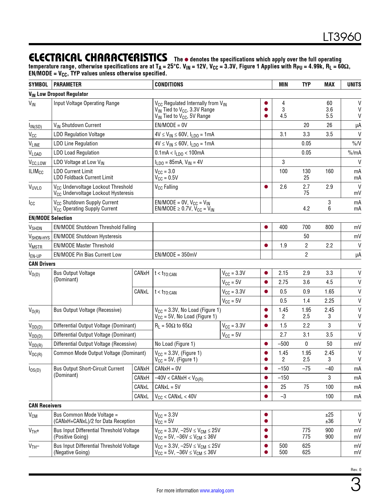 denotes the specifications which apply over the full operating temperature range, otherwise specifications are at TA = 25°C. VIN = 12V, VCC = 3.3V, Figure 1 Applies with R PU = 4.99k, RL = 60Ω, EN/MODE = VCC, TYP values unless otherwise specified. SYMBOL PARAMETER CONDITIONS MIN TYP MAX UNITS VIN Low Dropout Regulator