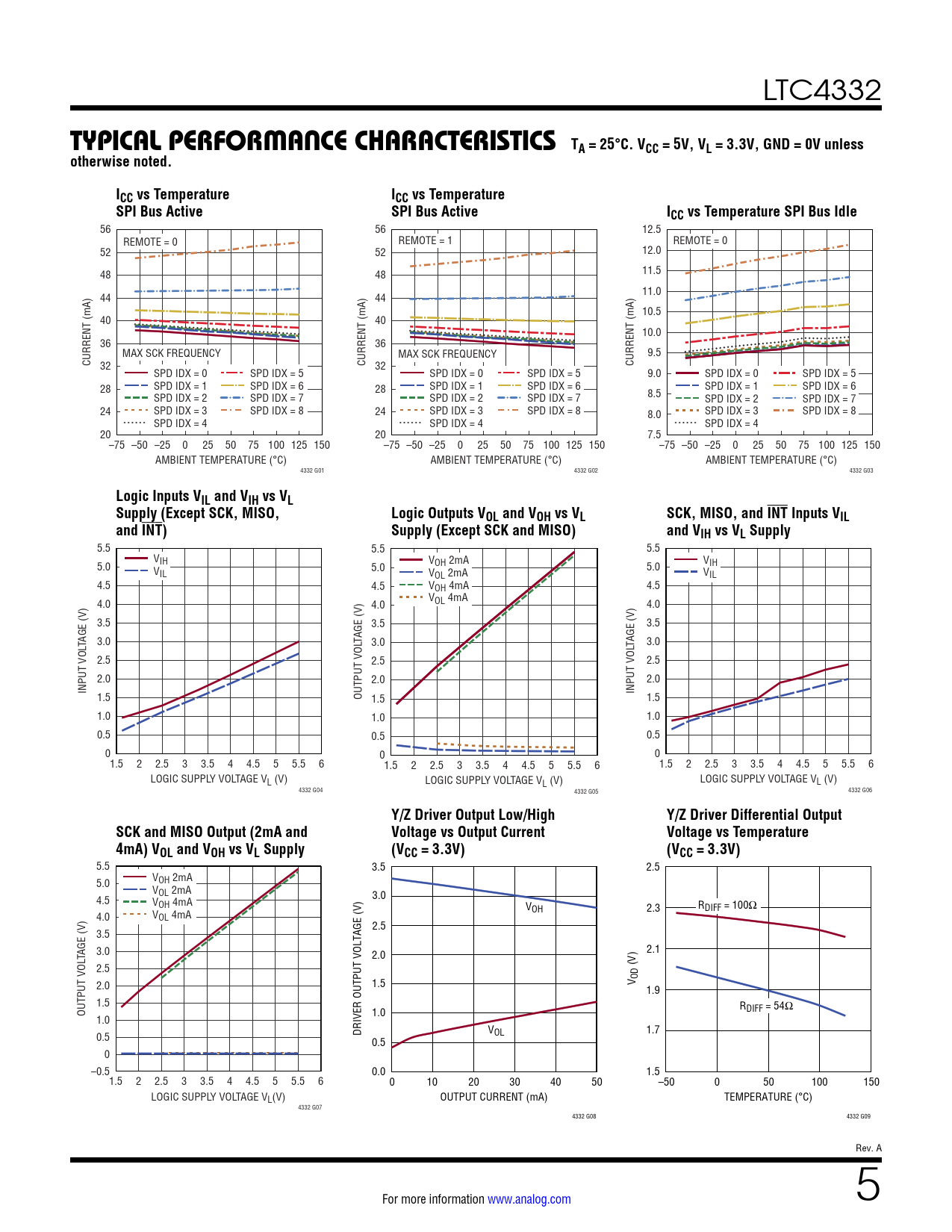 5.5 3.5 2.5 VOH 2mA 5.0 VOL 2mA 3.0 4.5 VOH 4mA VOH 2.3 RDIFF = 100Ω 4.0 VOL 4mA 2.5 3.5 3.0 TAGE (V) 2.0 2.1 (V) 2.5 2.0 1.5 V OD 1.9 1.5 R OUTPUT VOL 1.0 DIFF = 54Ω 1.0 DRIVER OUTPUT VOLTAGE (V) VOL 1.7 0.5 0.5 0 –0.5 0.0 1.5 1.5 2 2.5 3 3.5 4 4.5 5 5.5 6 0 10 20 30 40 50 –50 0 50 100 150 LOGIC SUPPLY VOLTAGE VL(V) OUTPUT CURRENT (mA) TEMPERATURE (°C) 4332 G07 4332 G08 4332 G09 Rev. A For more information www.analog.com 5 Document Outline Features Applications Typical Application Description Absolute Maximum Ratings Order Information Electrical Characteristics Pin Configuration Switching Characteristics Typical Performance Characteristics Pin Functions Block Diagram Test Circuits Timing Diagram Applications Information Package Description Typical Application Related Parts