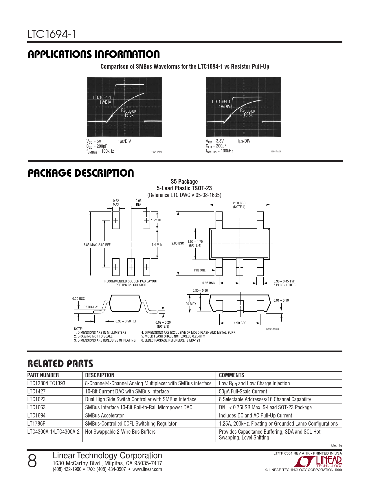 APPLICATIONS INFORMATION. Comparison of SMBus Waveforms for the LTC1694-1 vs Resistor Pull-Up. PACKAGE DESCRIPTION