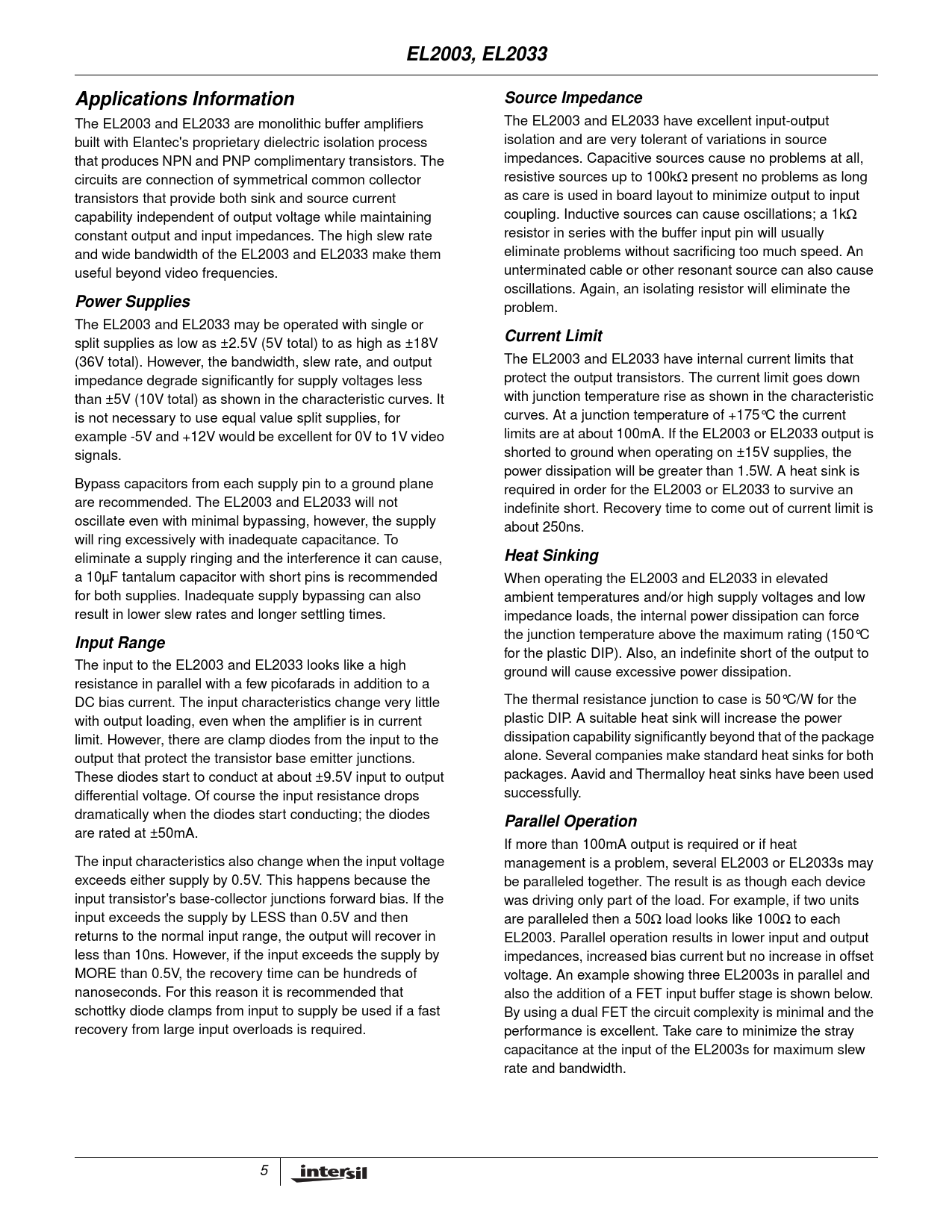 EL2003, EL2033 Applications Information Source Impedance Power Supplies Current Limit Heat Sinking Input Range