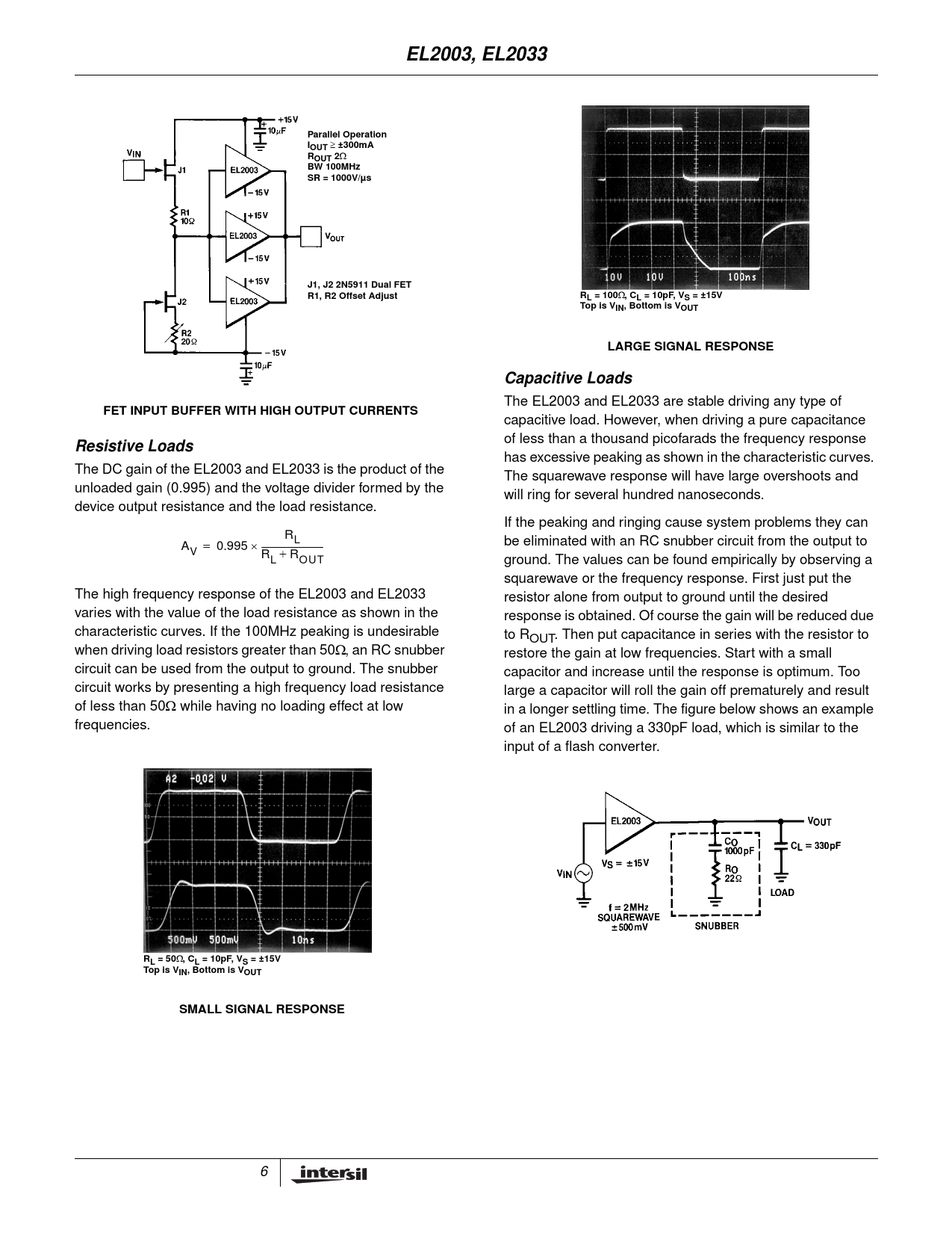 EL2003, EL2033Parallel Operation IOUT ≥ ±300mA ROUT 2 Ω BW 100MHz SR = 1000V/µsJ1, J2 2N5911 Dual FET R1, R2 Offset AdjustRL = 100 Ω , CL = 10pF, VS = ±15V Top is VIN, Bottom is VOUTLARGE SIGNAL RESPONSECapacitive Loads The EL2003 and EL2033 are stable driving any type of FET INPUT BUFFER WITH HIGH OUTPUT CURRENTS capacitive load. However, when driving a pure capacitance of less than a thousand picofarads the frequency response Resistive Loads has excessive peaking as shown in the characteristic curves. The DC gain of the EL2003 and EL2033 is the product of the The squarewave response will have large overshoots and unloaded gain (0.995) and the voltage divider formed by the will ring for several hundred nanoseconds. device output resistance and the load resistance. If the peaking and ringing cause system problems they can RL be eliminated with an RC snubber circuit from the output to A = 0.995 × --------------- V R + R L OUT ground. The values can be found empirically by observing a squarewave or the frequency response. First just put the The high frequency response of the EL2003 and EL2033 resistor alone from output to ground until the desired varies with the value of the load resistance as shown in the response is obtained. Of course the gain will be reduced due characteristic curves. If the 100MHz peaking is undesirable to ROUT. Then put capacitance in series with the resistor to when driving load resistors greater than 50Ω, an RC snubber restore the gain at low frequencies. Start with a small circuit can be used from the output to ground. The snubber capacitor and increase until the response is optimum. Too circuit works by presenting a high frequency load resistance large a capacitor will roll the gain off prematurely and result of less than 50Ω while having no loading effect at low in a longer settling time. The figure below shows an example frequencies. of an EL2003 driving a 330pF load, which is similar to the input of a flash converter. RL = 50 Ω , CL = 10pF, VS = ±15V Top is VIN, Bottom is VOUTSMALL SIGNAL RESPONSE 6