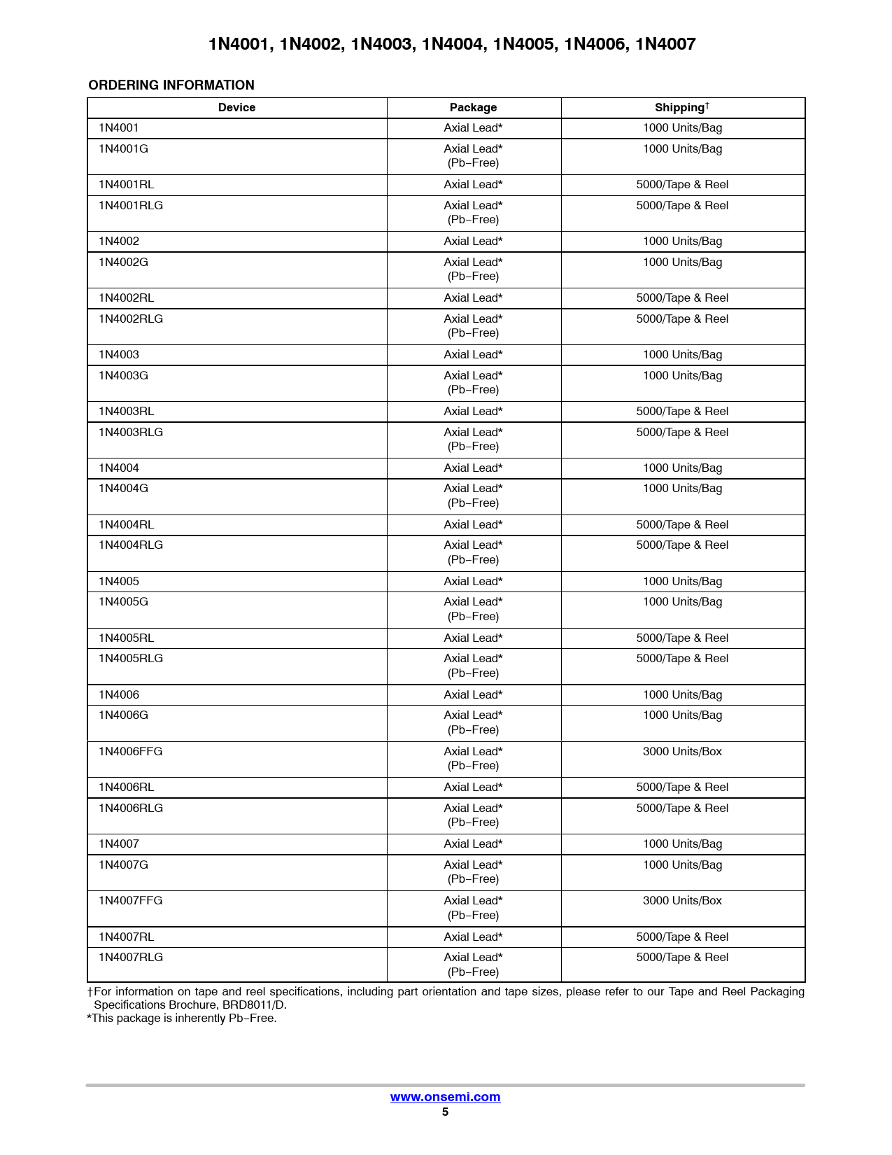 † 1N4001 Axial Lead* 1000 Units/Bag 1N4001G Axial Lead* 1000 Units/Bag (Pb−Free) 1N4001RL Axial Lead* 5000/Tape & Reel 1N4001RLG Axial Lead* 5000/Tape & Reel (Pb−Free) 1N4002 Axial Lead* 1000 Units/Bag 1N4002G Axial Lead* 1000 Units/Bag (Pb−Free) 1N4002RL Axial Lead* 5000/Tape & Reel 1N4002RLG Axial Lead* 5000/Tape & Reel (Pb−Free) 1N4003 Axial Lead* 1000 Units/Bag 1N4003G Axial Lead* 1000 Units/Bag (Pb−Free) 1N4003RL Axial Lead* 5000/Tape & Reel 1N4003RLG Axial Lead* 5000/Tape & Reel (Pb−Free) 1N4004 Axial Lead* 1000 Units/Bag 1N4004G Axial Lead* 1000 Units/Bag (Pb−Free) 1N4004RL Axial Lead* 5000/Tape & Reel 1N4004RLG Axial Lead* 5000/Tape & Reel (Pb−Free) 1N4005 Axial Lead* 1000 Units/Bag 1N4005G Axial Lead* 1000 Units/Bag (Pb−Free) 1N4005RL Axial Lead* 5000/Tape & Reel 1N4005RLG Axial Lead* 5000/Tape & Reel (Pb−Free) 1N4006 Axial Lead* 1000 Units/Bag 1N4006G Axial Lead* 1000 Units/Bag (Pb−Free) 1N4006FFG Axial Lead* 3000 Units/Box (Pb−Free) 1N4006RL Axial Lead* 5000/Tape & Reel 1N4006RLG Axial Lead* 5000/Tape & Reel (Pb−Free) 1N4007 Axial Lead* 1000 Units/Bag 1N4007G Axial Lead* 1000 Units/Bag (Pb−Free) 1N4007FFG Axial Lead* 3000 Units/Box (Pb−Free) 1N4007RL Axial Lead* 5000/Tape & Reel 1N4007RLG Axial Lead* 5000/Tape & Reel (Pb−Free) †For information on tape and reel specifications, including part orientation and tape sizes, please refer to our Tape and Reel Packaging Specifications Brochure, BRD8011/D. *This package is inherently Pb−Free.