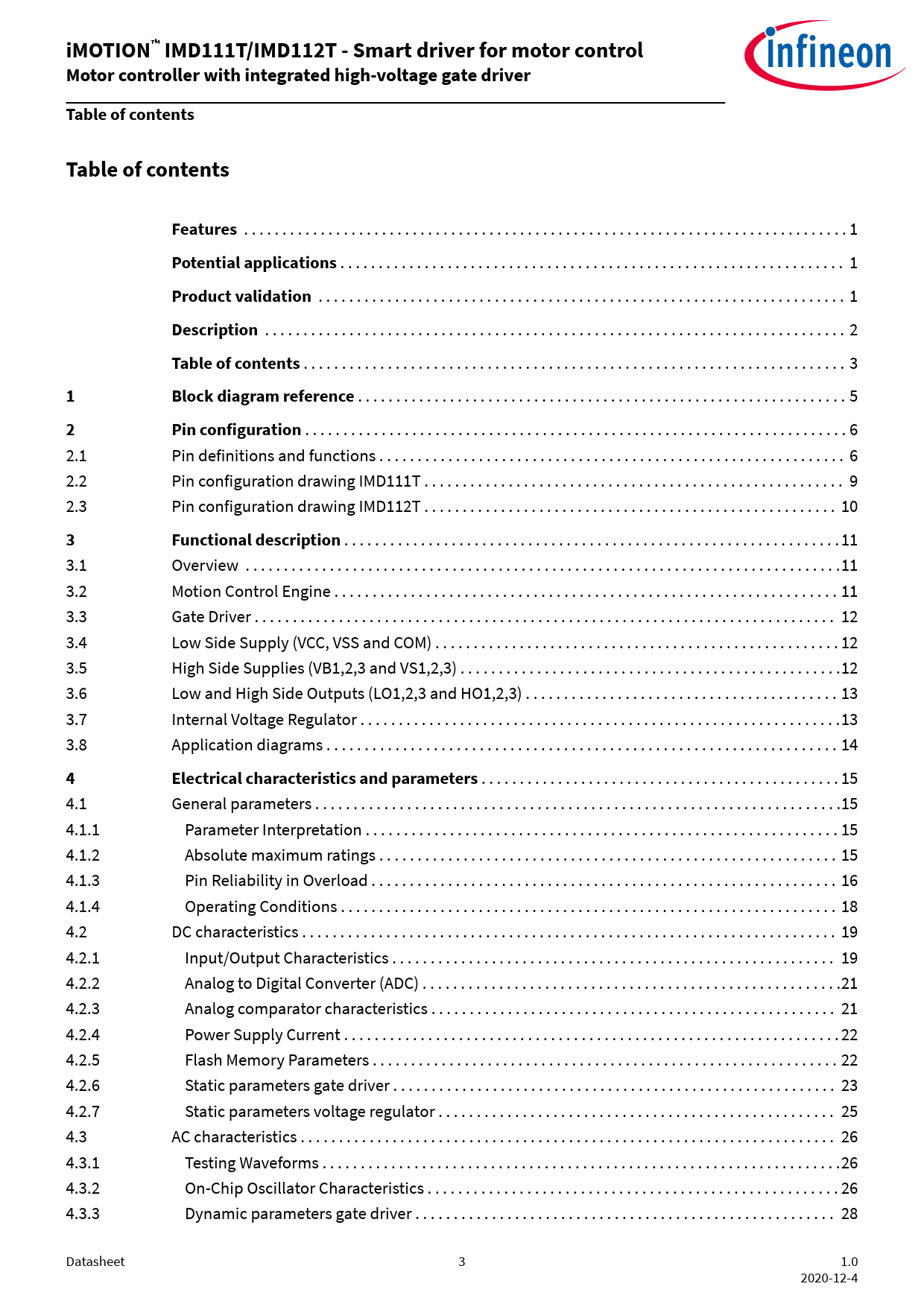 . 15 4.1 General parameters . .15 4.1.1 Parameter Interpretation . 15 4.1.2 Absolute maximum ratings . 15 4.1.3 Pin Reliability in Overload . 16 4.1.4 Operating Conditions . 18 4.2 DC characteristics . 19 4.2.1 Input/Output Characteristics . 19 4.2.2 Analog to Digital Converter (ADC) . .21 4.2.3 Analog comparator characteristics . 21 4.2.4 Power Supply Current . 22 4.2.5 Flash Memory Parameters . 22 4.2.6 Static parameters gate driver . 23 4.2.7 Static parameters voltage regulator . 25 4.3 AC characteristics . 26 4.3.1 Testing Waveforms . .26 4.3.2 On-Chip Oscillator Characteristics . 26 4.3.3 Dynamic parameters gate driver . 28 Datasheet 3 1.0 2020-12-4 Document Outline Features Potential applications Product validation Description Table of contents 1 Block diagram reference 2 Pin configuration 2.1 Pin definitions and functions 2.2 Pin configuration drawing IMD111T 2.3 Pin configuration drawing IMD112T 3 Functional description 3.1 Overview 3.2 Motion Control Engine 3.3 Gate Driver 3.4 Low Side Supply (VCC, VSS and COM) 3.5 High Side Supplies (VB1,2,3 and VS1,2,3) 3.6 Low and High Side Outputs (LO1,2,3 and HO1,2,3) 3.7 Internal Voltage Regulator 3.8 Application diagrams 4 Electrical characteristics and parameters 4.1 General parameters 4.1.1 Parameter Interpretation 4.1.2 Absolute maximum ratings 4.1.3 Pin Reliability in Overload 4.1.4 Operating Conditions 4.2 DC characteristics 4.2.1 Input/Output Characteristics 4.2.2 Analog to Digital Converter (ADC) 4.2.3 Analog comparator characteristics 4.2.4 Power Supply Current 4.2.5 Flash Memory Parameters 4.2.6 Static parameters gate driver 4.2.7 Static parameters voltage regulator 4.3 AC characteristics 4.3.1 Testing Waveforms 4.3.2 On-Chip Oscillator Characteristics 4.3.3 Dynamic parameters gate driver 4.3.4 Timing diagrams 4.4 Motor Control Parameters 4.4.1 PWM Characteristics 4.4.2 Current Sensing 4.4.3 Fault Timing 4.5 Power Factor Correction (PFC) parameters 4.5.1 Boost PFC characteristics 4.5.2 Totem Pole PFC characteristics 4.5.3 PFC Current Sensing 4.6 Control Interface Parameters 4.6.1 Control Input Interfaces 4.6.2 Serial Interface Parameters 4.6.2.1 UART Interface 4.6.3 Over Temperature Input 4.6.4 Pulse Output 5 Device and package specifications 5.1 Quality declaration 5.2 SBSL and Chip-IDs 5.3 Thermal considerations 5.4 Package Outline PG-LQFP-40-1 5.5 Part marking information Revision history Disclaimer