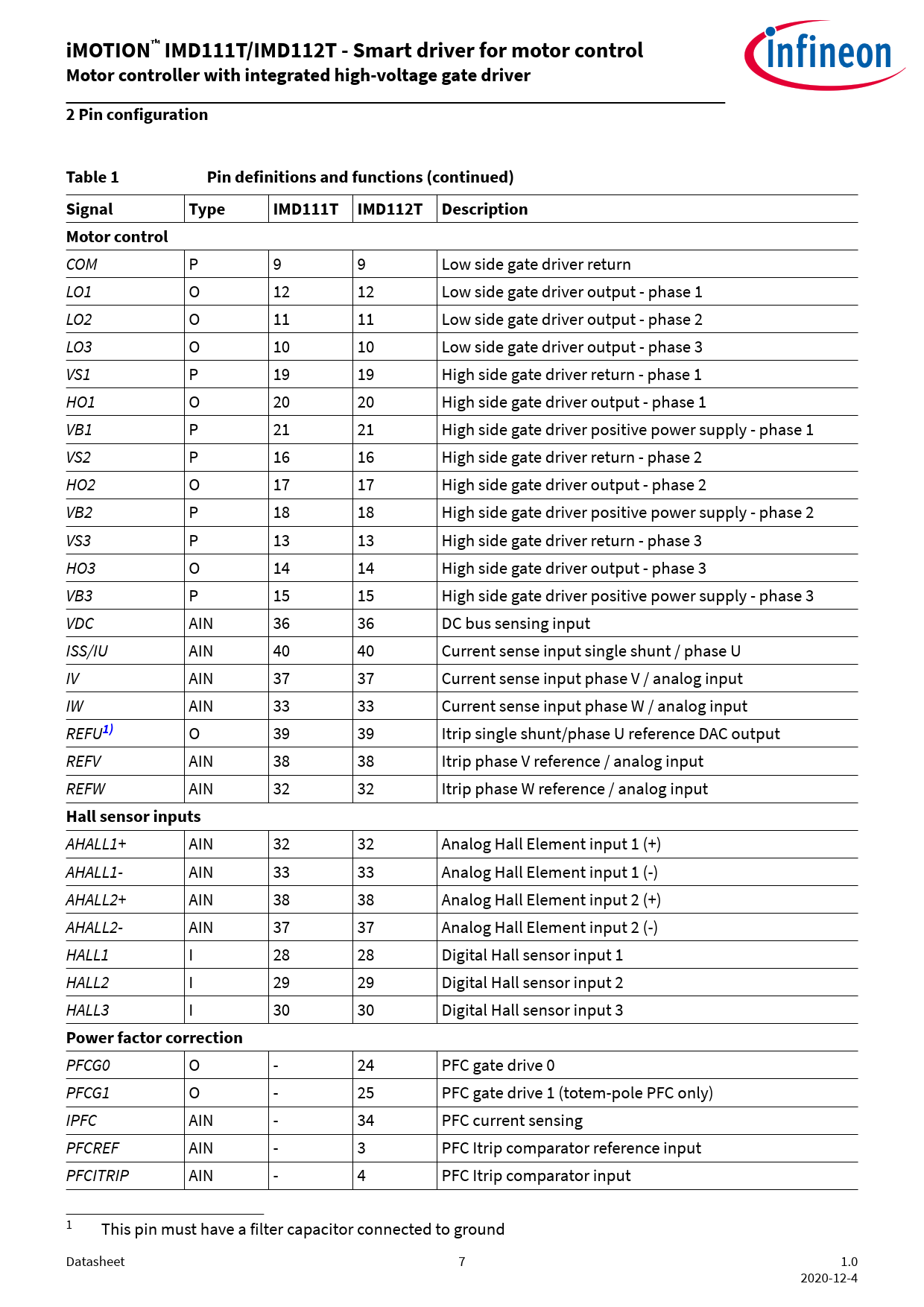 link to page 7 iMOTION™ IMD111T/IMD112T - Smart driver for motor controlMotor controller with integrated high-voltage gate driver2 Pin configurationTable 1Pin definitions and functions (continued)SignalTypeIMD111T IMD112T DescriptionMotor control COM P 9 9 Low side gate driver return LO1 O 12 12 Low side gate driver output - phase 1 LO2 O 11 11 Low side gate driver output - phase 2 LO3 O 10 10 Low side gate driver output - phase 3 VS1 P 19 19 High side gate driver return - phase 1 HO1 O 20 20 High side gate driver output - phase 1 VB1 P 21 21 High side gate driver positive power supply - phase 1 VS2 P 16 16 High side gate driver return - phase 2 HO2 O 17 17 High side gate driver output - phase 2 VB2 P 18 18 High side gate driver positive power supply - phase 2 VS3 P 13 13 High side gate driver return - phase 3 HO3 O 14 14 High side gate driver output - phase 3 VB3 P 15 15 High side gate driver positive power supply - phase 3 VDC AIN 36 36 DC bus sensing input ISS/IU AIN 40 40 Current sense input single shunt / phase U IV AIN 37 37 Current sense input phase V / analog input IW AIN 33 33 Current sense input phase W / analog input REFU 1) O 39 39 Itrip single shunt/phase U reference DAC output REFV AIN 38 38 Itrip phase V reference / analog input REFW AIN 32 32 Itrip phase W reference / analog input Hall sensor inputs AHALL1+ AIN 32 32 Analog Hall Element input 1 (+) AHALL1- AIN 33 33 Analog Hall Element input 1 (-) AHALL2+ AIN 38 38 Analog Hall Element input 2 (+) AHALL2- AIN 37 37 Analog Hall Element input 2 (-) HALL1 I 28 28 Digital Hall sensor input 1 HALL2 I 29 29 Digital Hall sensor input 2 HALL3 I 30 30 Digital Hall sensor input 3 Power factor correction PFCG0 O - 24 PFC gate drive 0 PFCG1 O - 25 PFC gate drive 1 (totem-pole PFC only) IPFC AIN - 34 PFC current sensing PFCREF AIN - 3 PFC Itrip comparator reference input PFCITRIP AIN - 4 PFC Itrip comparator input 1 This pin must have a filter capacitor connected to ground Datasheet 7 1.0 2020-12-4 Document Outline Features Potential applications Product validation Description Table of contents 1 Block diagram reference 2 Pin configuration 2.1 Pin definitions and functions 2.2 Pin configuration drawing IMD111T 2.3 Pin configuration drawing IMD112T 3 Functional description 3.1 Overview 3.2 Motion Control Engine 3.3 Gate Driver 3.4 Low Side Supply (VCC, VSS and COM) 3.5 High Side Supplies (VB1,2,3 and VS1,2,3) 3.6 Low and High Side Outputs (LO1,2,3 and HO1,2,3) 3.7 Internal Voltage Regulator 3.8 Application diagrams 4 Electrical characteristics and parameters 4.1 General parameters 4.1.1 Parameter Interpretation 4.1.2 Absolute maximum ratings 4.1.3 Pin Reliability in Overload 4.1.4 Operating Conditions 4.2 DC characteristics 4.2.1 Input/Output Characteristics 4.2.2 Analog to Digital Converter (ADC) 4.2.3 Analog comparator characteristics 4.2.4 Power Supply Current 4.2.5 Flash Memory Parameters 4.2.6 Static parameters gate driver 4.2.7 Static parameters voltage regulator 4.3 AC characteristics 4.3.1 Testing Waveforms 4.3.2 On-Chip Oscillator Characteristics 4.3.3 Dynamic parameters gate driver 4.3.4 Timing diagrams 4.4 Motor Control Parameters 4.4.1 PWM Characteristics 4.4.2 Current Sensing 4.4.3 Fault Timing 4.5 Power Factor Correction (PFC) parameters 4.5.1 Boost PFC characteristics 4.5.2 Totem Pole PFC characteristics 4.5.3 PFC Current Sensing 4.6 Control Interface Parameters 4.6.1 Control Input Interfaces 4.6.2 Serial Interface Parameters 4.6.2.1 UART Interface 4.6.3 Over Temperature Input 4.6.4 Pulse Output 5 Device and package specifications 5.1 Quality declaration 5.2 SBSL and Chip-IDs 5.3 Thermal considerations 5.4 Package Outline PG-LQFP-40-1 5.5 Part marking information Revision history Disclaimer