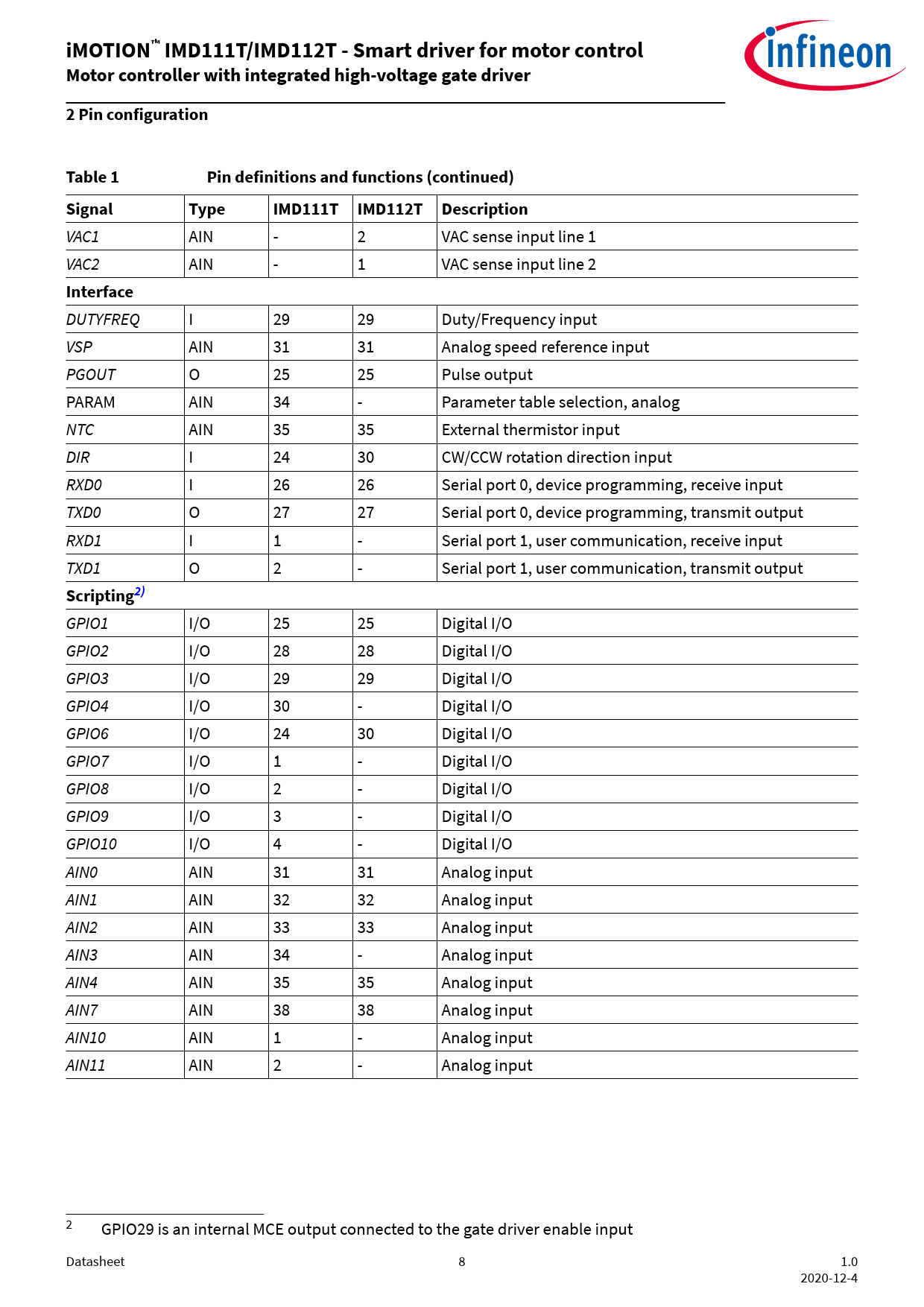 link to page 8 iMOTION™ IMD111T/IMD112T - Smart driver for motor controlMotor controller with integrated high-voltage gate driver2 Pin configurationTable 1Pin definitions and functions (continued)SignalTypeIMD111T IMD112T Description VAC1 AIN - 2 VAC sense input line 1 VAC2 AIN - 1 VAC sense input line 2 Interface DUTYFREQ I 29 29 Duty/Frequency input VSP AIN 31 31 Analog speed reference input PGOUT O 25 25 Pulse output PARAM AIN 34 - Parameter table selection, analog NTC AIN 35 35 External thermistor input DIR I 24 30 CW/CCW rotation direction input RXD0 I 26 26 Serial port 0, device programming, receive input TXD0 O 27 27 Serial port 0, device programming, transmit output RXD1 I 1 - Serial port 1, user communication, receive input TXD1 O 2 - Serial port 1, user communication, transmit output Scripting2) GPIO1 I/O 25 25 Digital I/O GPIO2 I/O 28 28 Digital I/O GPIO3 I/O 29 29 Digital I/O GPIO4 I/O 30 - Digital I/O GPIO6 I/O 24 30 Digital I/O GPIO7 I/O 1 - Digital I/O GPIO8 I/O 2 - Digital I/O GPIO9 I/O 3 - Digital I/O GPIO10 I/O 4 - Digital I/O AIN0 AIN 31 31 Analog input AIN1 AIN 32 32 Analog input AIN2 AIN 33 33 Analog input AIN3 AIN 34 - Analog input AIN4 AIN 35 35 Analog input AIN7 AIN 38 38 Analog input AIN10 AIN 1 - Analog input AIN11 AIN 2 - Analog input 2 GPIO29 is an internal MCE output connected to the gate driver enable input Datasheet 8 1.0 2020-12-4 Document Outline Features Potential applications Product validation Description Table of contents 1 Block diagram reference 2 Pin configuration 2.1 Pin definitions and functions 2.2 Pin configuration drawing IMD111T 2.3 Pin configuration drawing IMD112T 3 Functional description 3.1 Overview 3.2 Motion Control Engine 3.3 Gate Driver 3.4 Low Side Supply (VCC, VSS and COM) 3.5 High Side Supplies (VB1,2,3 and VS1,2,3) 3.6 Low and High Side Outputs (LO1,2,3 and HO1,2,3) 3.7 Internal Voltage Regulator 3.8 Application diagrams 4 Electrical characteristics and parameters 4.1 General parameters 4.1.1 Parameter Interpretation 4.1.2 Absolute maximum ratings 4.1.3 Pin Reliability in Overload 4.1.4 Operating Conditions 4.2 DC characteristics 4.2.1 Input/Output Characteristics 4.2.2 Analog to Digital Converter (ADC) 4.2.3 Analog comparator characteristics 4.2.4 Power Supply Current 4.2.5 Flash Memory Parameters 4.2.6 Static parameters gate driver 4.2.7 Static parameters voltage regulator 4.3 AC characteristics 4.3.1 Testing Waveforms 4.3.2 On-Chip Oscillator Characteristics 4.3.3 Dynamic parameters gate driver 4.3.4 Timing diagrams 4.4 Motor Control Parameters 4.4.1 PWM Characteristics 4.4.2 Current Sensing 4.4.3 Fault Timing 4.5 Power Factor Correction (PFC) parameters 4.5.1 Boost PFC characteristics 4.5.2 Totem Pole PFC characteristics 4.5.3 PFC Current Sensing 4.6 Control Interface Parameters 4.6.1 Control Input Interfaces 4.6.2 Serial Interface Parameters 4.6.2.1 UART Interface 4.6.3 Over Temperature Input 4.6.4 Pulse Output 5 Device and package specifications 5.1 Quality declaration 5.2 SBSL and Chip-IDs 5.3 Thermal considerations 5.4 Package Outline PG-LQFP-40-1 5.5 Part marking information Revision history Disclaimer