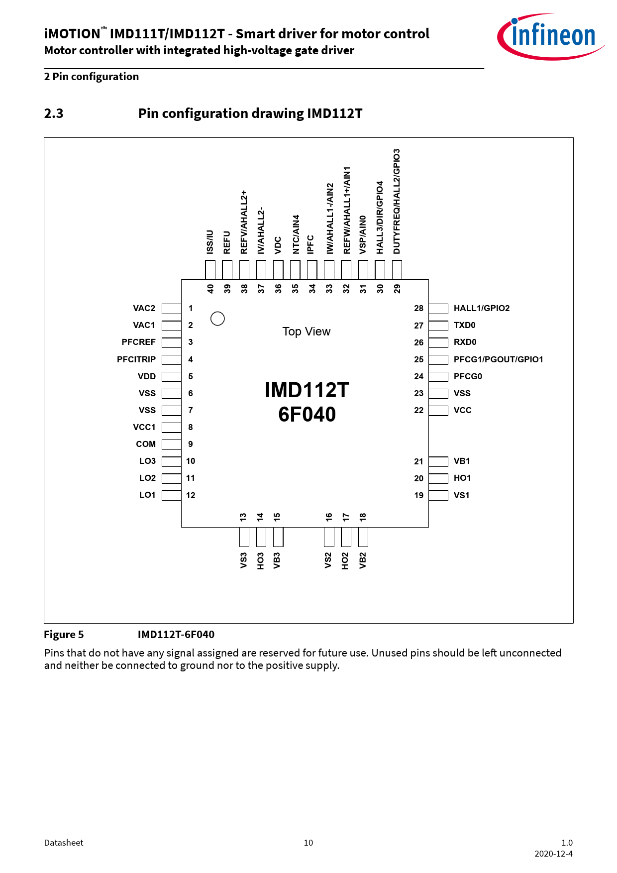 Pins that do not have any signal assigned are reserved for future use. Unused pins should be left unconnected and neither be connected to ground nor to the positive supply. Datasheet 10 1.0 2020-12-4 Document Outline Features Potential applications Product validation Description Table of contents 1 Block diagram reference 2 Pin configuration 2.1 Pin definitions and functions 2.2 Pin configuration drawing IMD111T 2.3 Pin configuration drawing IMD112T 3 Functional description 3.1 Overview 3.2 Motion Control Engine 3.3 Gate Driver 3.4 Low Side Supply (VCC, VSS and COM) 3.5 High Side Supplies (VB1,2,3 and VS1,2,3) 3.6 Low and High Side Outputs (LO1,2,3 and HO1,2,3) 3.7 Internal Voltage Regulator 3.8 Application diagrams 4 Electrical characteristics and parameters 4.1 General parameters 4.1.1 Parameter Interpretation 4.1.2 Absolute maximum ratings 4.1.3 Pin Reliability in Overload 4.1.4 Operating Conditions 4.2 DC characteristics 4.2.1 Input/Output Characteristics 4.2.2 Analog to Digital Converter (ADC) 4.2.3 Analog comparator characteristics 4.2.4 Power Supply Current 4.2.5 Flash Memory Parameters 4.2.6 Static parameters gate driver 4.2.7 Static parameters voltage regulator 4.3 AC characteristics 4.3.1 Testing Waveforms 4.3.2 On-Chip Oscillator Characteristics 4.3.3 Dynamic parameters gate driver 4.3.4 Timing diagrams 4.4 Motor Control Parameters 4.4.1 PWM Characteristics 4.4.2 Current Sensing 4.4.3 Fault Timing 4.5 Power Factor Correction (PFC) parameters 4.5.1 Boost PFC characteristics 4.5.2 Totem Pole PFC characteristics 4.5.3 PFC Current Sensing 4.6 Control Interface Parameters 4.6.1 Control Input Interfaces 4.6.2 Serial Interface Parameters 4.6.2.1 UART Interface 4.6.3 Over Temperature Input 4.6.4 Pulse Output 5 Device and package specifications 5.1 Quality declaration 5.2 SBSL and Chip-IDs 5.3 Thermal considerations 5.4 Package Outline PG-LQFP-40-1 5.5 Part marking information Revision history Disclaimer
