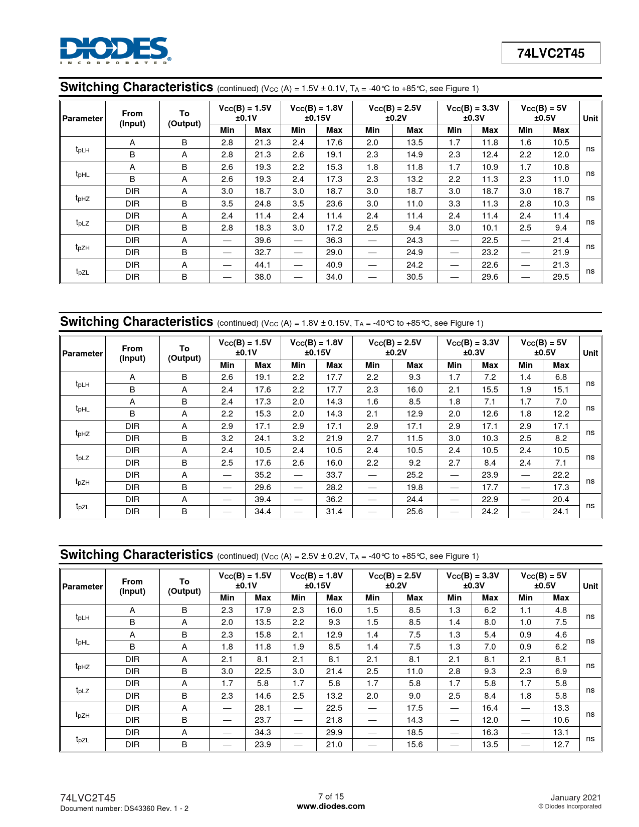 | 页数 / 页 | 15 / 7 — 74LVC2T45. Switching Characteristics. VCC(B) = 1.5V. VCC(B) = 1.8V. … |