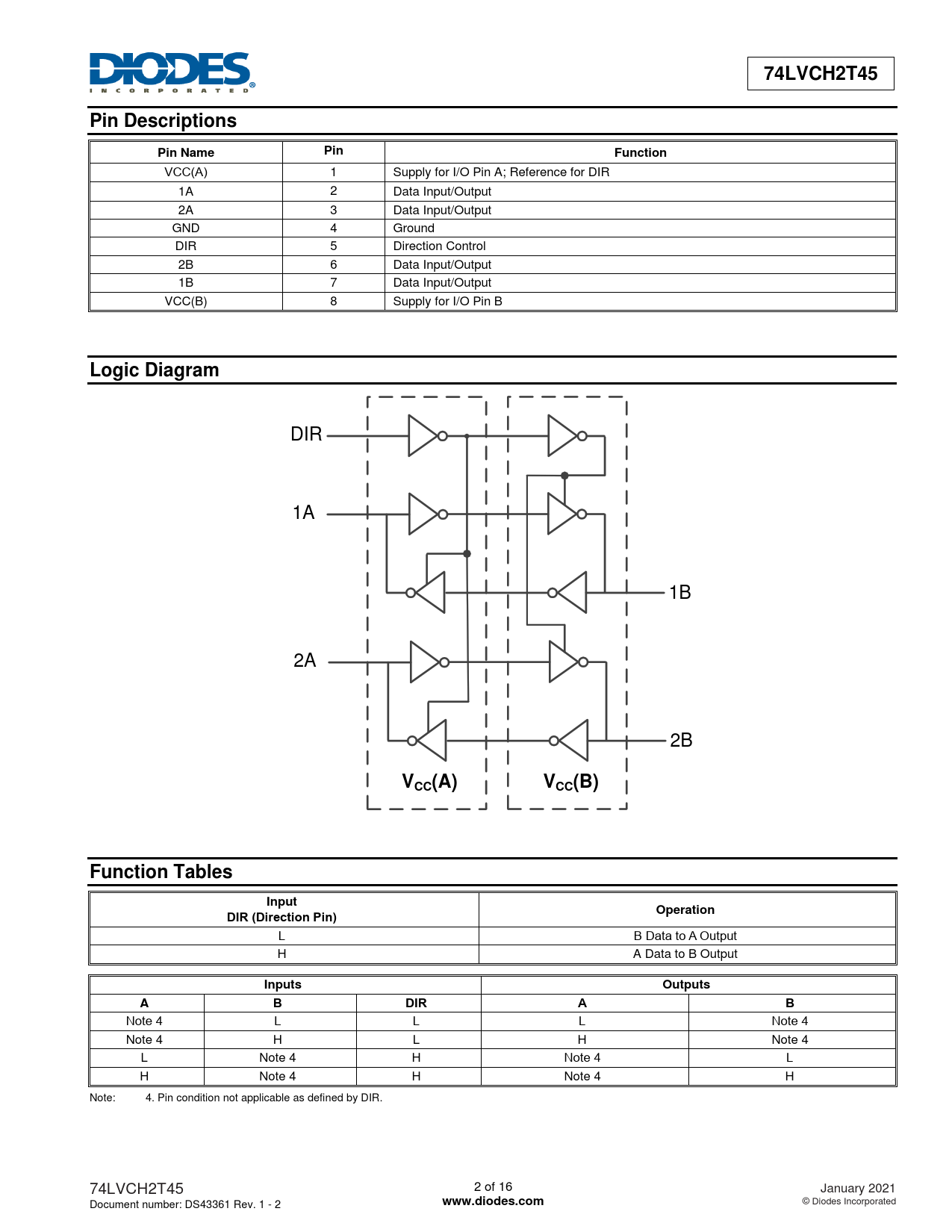 74LVCH2T45. Pin Descriptions. Pin Name. Pin. Function. Logic Diagram. VCC(A). VCC(B). Function Tables. Input. DIR (Direction Pin). Operation