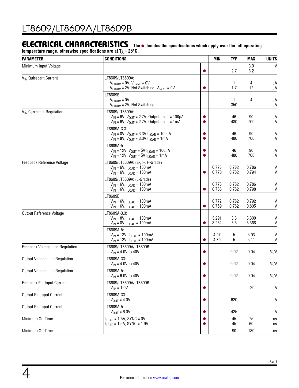 Minimum Input Voltage 3.0 V l 2.7 3.2 VIN Quiescent Current LT8609/LT8609A: VEN/UV = 0V, VSYNC = 0V 1 4 µA VEN/UV = 2V, Not Switching, VSYNC = 0V l 1.7 12 µA LT8609B: VEN/UV = 0V 1 4 µA VEN/UV = 2V, Not Switching 350 µA VIN Current in Regulation LT8609/LT8609A: VIN = 6V, VOUT = 2.7V, Output Load = 100μA l 46 90 μA VIN = 6V, VOUT = 2.7V, Output Load = 1mA l 480 700 μA LT8609A-3.3: VIN = 8V, VOUT = 3.3V ILOAD = 100μA l 46 90 μA VIN = 8V, VOUT = 3.3V ILOAD = 1mA l 480 700 μA LT8609A-5: VIN = 12V, VOUT = 5V ILOAD = 100μA l 46 90 μA VIN = 12V, VOUT = 5V ILOAD = 1mA l 480 700 μA Feedback Reference Voltage LT8609/LT8609A: (E-, I-, H-Grade) VIN = 6V, ILOAD = 100mA 0.778 0.782 0.786 V VIN = 6V, ILOAD = 100mA l 0.770 0.782 0.794 V LT8609/LT8609A: (J-Grade) VIN = 6V, ILOAD = 100mA 0.778 0.782 0.786 V VIN = 6V, ILOAD = 100mA l 0.766 0.782 0.798 V LT8609B: VIN = 6V, ILOAD = 100mA 0.772 0.782 0.792 V VIN = 6V, ILOAD = 100mA l 0.759 0.782 0.805 V Output Reference Voltage LT8609A-3.3: VIN = 8V, ILOAD = 100mA 3.291 3.3 3.309 V VIN = 8V, ILOAD = 100mA l 3.232 3.3 3.368 V LT8609A-5: VIN = 12V, ILOAD = 100mA 4.97 5 5.03 V VIN = 12V, ILOAD = 100mA l 4.89 5 5.11 V Feedback Voltage Line Regulation LT8609/LT8609A/LT8609B: VIN = 4.0V to 40V l 0.02 0.04 %/V Output Voltage Line Regulation LT8609A-33: VIN = 4.0V to 40V l 0.02 0.04 %/V Output Voltage Line Regulation LT8609A-5: VIN = 6.0V to 40V l 0.02 0.04 %/V Feedback Pin Input Current LT8609/LT8609A/LT8609B: VFB = 1.0V l ±20 nA Output Pin Input Current LT8609A-33: VOUT = 4.0V l 620 nA Output Pin Input Current LT8609A-5: VOUT = 6.0V l 425 nA Minimum On-Time ILOAD = 1.5A, SYNC = 0V l 45 75 ns ILOAD = 1.5A, SYNC = 1.9V l 45 60 ns Minimum Off Time 90 130 ns Rev. I 4 For more information www.analog.com Document Outline Features Applications Typical Application Description Absolute Maximum Ratings Pin Configuration Order Information Typical Performance Characteristics Pin Functions Block Diagram Operation Applications Information Typical Applications Package Description Revision History Typical Application Related Parts