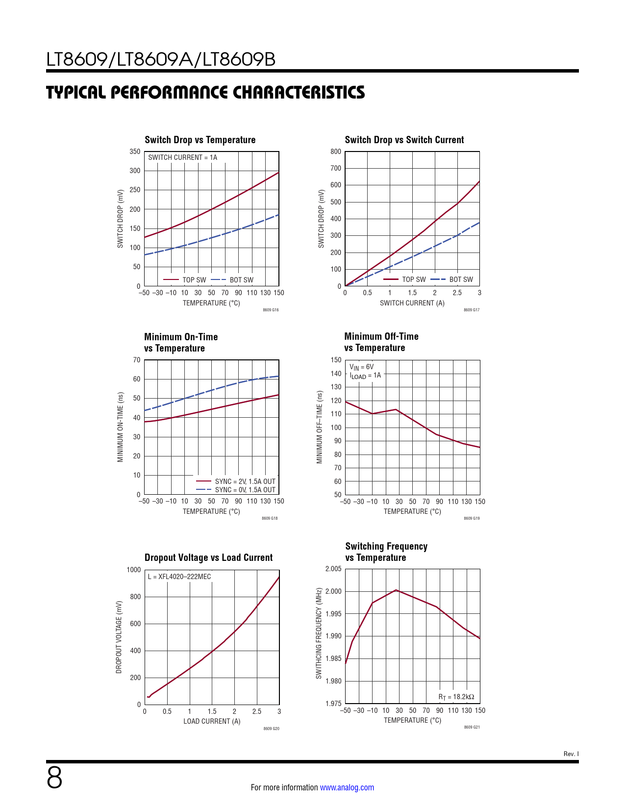 350 800 SWITCH CURRENT = 1A 300 700 600 250 500 200 400 150 300 SWITCH DROP (mV) 100 SWITCH DROP (mV) 200 50 100 TOP SW BOT SW TOP SW BOT SW 0 0 –50 –30 –10 10 30 50 70 90 110 130 150 0 0.5 1 1.5 2 2.5 3 TEMPERATURE (°C) SWITCH CURRENT (A) 8609 G16 8609 G17
