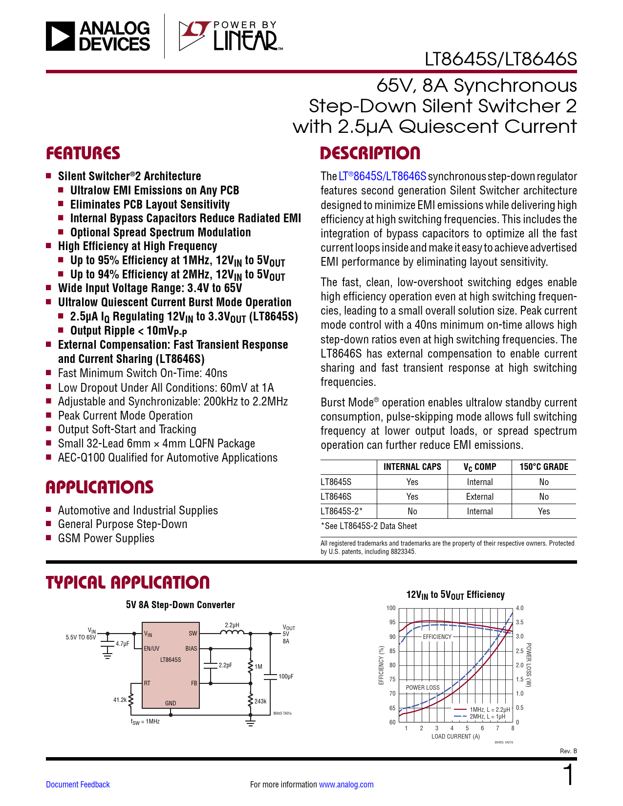 LT8645S/LT8646S 65V, 8A Synchronous Step-Down Silent Switcher 2 with 2.5µA Quiescent Current FEATURESDESCRIPTION n Silent Switcher®2 Architecture The LT®8645S/LT8646S synchronous step-down regulator n Ultralow EMI Emissions on Any PCB features second generation Silent Switcher architecture n Eliminates PCB Layout Sensitivity designed to minimize EMI emissions while delivering high n Internal Bypass Capacitors Reduce Radiated EMI efficiency at high switching frequencies. This includes the n Optional Spread Spectrum Modulation integration of bypass capacitors to optimize all the fast n High Efficiency at High Frequency current loops inside and make it easy to achieve advertised n Up to 95% Efficiency at 1MHz, 12VIN to 5VOUT EMI performance by eliminating layout sensitivity. n Up to 94% Efficiency at 2MHz, 12VIN to 5VOUT The fast, clean, low-overshoot switching edges enable n Wide Input Voltage Range: 3.4V to 65V n high efficiency operation even at high switching frequen- Ultralow Quiescent Current Burst Mode Operation n cies, leading to a small overall solution size. Peak current 2.5μA IQ Regulating 12VIN to 3.3VOUT (LT8645S) n mode control with a 40ns minimum on-time allows high Output Ripple < 10mVP-P n step-down ratios even at high switching frequencies. The External Compensation: Fast Transient Response LT8646S has external compensation to enable current and Current Sharing (LT8646S) n sharing and fast transient response at high switching Fast Minimum Switch On-Time: 40ns n frequencies. Low Dropout Under All Conditions: 60mV at 1A n Adjustable and Synchronizable: 200kHz to 2.2MHz Burst Mode® operation enables ultralow standby current n Peak Current Mode Operation consumption, pulse-skipping mode allows full switching n Output Soft-Start and Tracking frequency at lower output loads, or spread spectrum n Small 32-Lead 6mm × 4mm LQFN Package operation can further reduce EMI emissions. n AEC-Q100 Qualified for Automotive Applications INTERNAL CAPSVC COMP150°C GRADE LT8645S Yes Internal No APPLICATIONS LT8646S Yes External No n Automotive and Industrial Supplies LT8645S-2* No Internal Yes n General Purpose Step-Down *See LT8645S-2 Data Sheet n GSM Power Supplies All registered trademarks and trademarks are the property of their respective owners. Protected by U.S. patents, including 8823345. TYPICAL APPLICATION12VIN to 5VOUT Efficiency5V 8A Step-Down Converter 100 4.0 2.2µH 95 3.5 V VOUT IN VIN SW 5.5V TO 65V 5V 90 EFFICIENCY 3.0 8A 4.7µF POWER LOSS (W) EN/UV BIAS 85 2.5 LT8645S 2.2pF 1M 80 2.0 100µF 75 1.5 RT FB EFFICIENCY (%) POWER LOSS 70 1.0 41.2k GND 243k 65 1MHz, L = 2.2µH 0.5 8645S TA01a 2MHz, L = 1µH fSW = 1MHz 60 0 1 2 3 4 5 6 7 8 LOAD CURRENT (A) 8645S TA01b Rev. B Document Feedback For more information www.analog.com 1 Document Outline Features Applications Typical Application Description Absolute Maximum Ratings Pin Configuration Order Information Electrical Characteristics Typical Performance Characteristics Pin Functions Block Diagram Operation Applications Information Package Description Revision History Typical Applications Related Parts