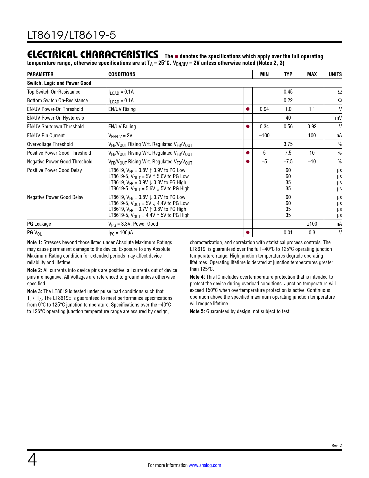 LT8619/LT8619-5 ELECTRICAL CHARACTERISTICSThe l denotes the specifications which apply over the full operatingtemperature range, otherwise specifications are at TA = 25°C. VEN/UV = 2V unless otherwise noted (Notes 2, 3) PARAMETERCONDITIONSMINTYPMAXUNITSSwitch, Logic and Power Good Top Switch On-Resistance ILOAD = 0.1A 0.45 Ω Bottom Switch On-Resistance ILOAD = 0.1A 0.22 Ω EN/UV Power-On Threshold EN/UV Rising l 0.94 1.0 1.1 V EN/UV Power-On Hysteresis 40 mV EN/UV Shutdown Threshold EN/UV Falling l 0.34 0.56 0.92 V EN/UV Pin Current VEN/UV = 2V –100 100 nA Overvoltage Threshold VFB/VOUT Rising Wrt. Regulated VFB/VOUT 3.75 % Positive Power Good Threshold VFB/VOUT Rising Wrt. Regulated VFB/VOUT l 5 7.5 10 % Negative Power Good Threshold VFB/VOUT Rising Wrt. Regulated VFB/VOUT l –5 –7.5 –10 % Positive Power Good Delay LT8619, VFB = 0.8V ↑ 0.9V to PG Low 60 µs LT8619-5, VOUT = 5V ↑ 5.6V to PG Low 60 µs LT8619, VFB = 0.9V ↓ 0.8V to PG High 35 µs LT8619-5, VOUT = 5.6V ↓ 5V to PG High 35 µs Negative Power Good Delay LT8619, VFB = 0.8V ↓ 0.7V to PG Low 60 µs LT8619-5, VOUT = 5V ↓ 4.4V to PG Low 60 µs LT8619, VFB = 0.7V ↑ 0.8V to PG High 35 µs LT8619-5, VOUT = 4.4V ↑ 5V to PG High 35 µs PG Leakage VPG = 3.3V, Power Good ±100 nA PG VOL IPG = 100µA l 0.01 0.3 V Note 1: Stresses beyond those listed under Absolute Maximum Ratings characterization, and correlation with statistical process controls. The may cause permanent damage to the device. Exposure to any Absolute LT8619I is guaranteed over the full –40°C to 125°C operating junction Maximum Rating condition for extended periods may affect device temperature range. High junction temperatures degrade operating reliability and lifetime. lifetimes. Operating lifetime is derated at junction temperatures greater Note 2: All currents into device pins are positive; all currents out of device than 125°C. pins are negative. All Voltages are referenced to ground unless otherwise Note 4: This IC includes overtemperature protection that is intended to specified. protect the device during overload conditions. Junction temperature will Note 3: The LT8619 is tested under pulse load conditions such that exceed 150°C when overtemperature protection is active. Continuous T operation above the specified maximum operating junction temperature J ≈ TA. The LT8619E is guaranteed to meet performance specifications from 0°C to 125°C junction temperature. Specifications over the –40°C will reduce lifetime. to 125°C operating junction temperature range are assured by design, Note 5: Guaranteed by design, not subject to test. Rev. C 4 For more information www.analog.com Document Outline Features Applications Typical Application Description Absolute Maximum Ratings Order Information Electrical Characteristics Typical Performance Characteristics Pin Functions Block Diagram Operation Applications Information Revision History Typical Application Related Parts