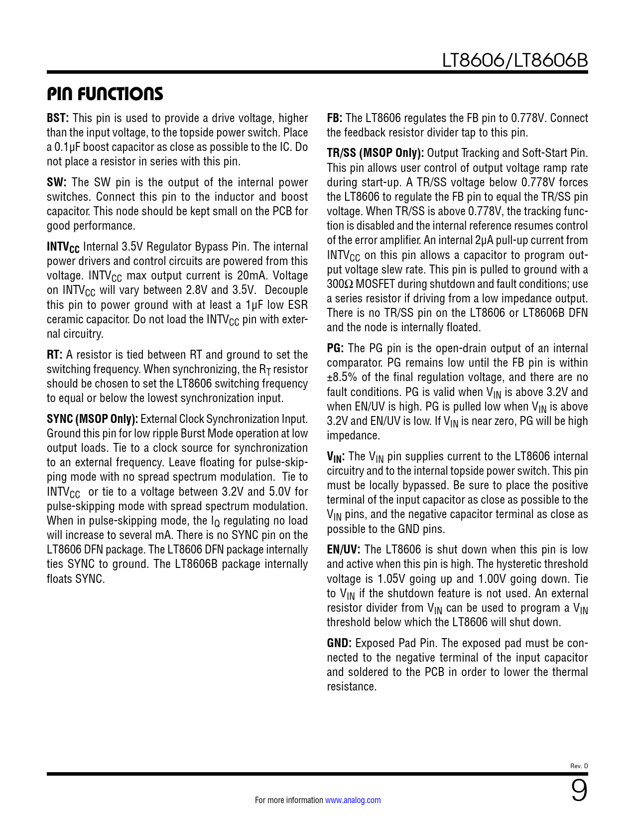 PIN FUNCTIONS BST:. FB:. TR/SS (MSOP Only):. SW:. INTV. RT:. PG:. SYNC (MSOP Only):. VIN:. EN/UV:. GND: