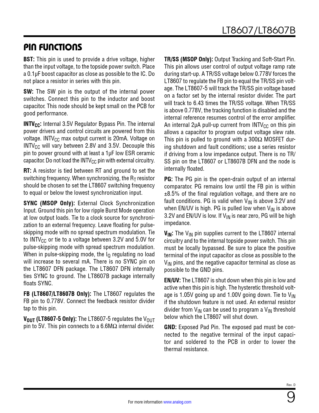 PIN FUNCTIONS BST:. TR/SS (MSOP Only):. SW:. INTVCC:. RT:. PG:. SYNC (MSOP Only):. VIN:. EN/UV:. FB (LT8607/LT8607B Only):