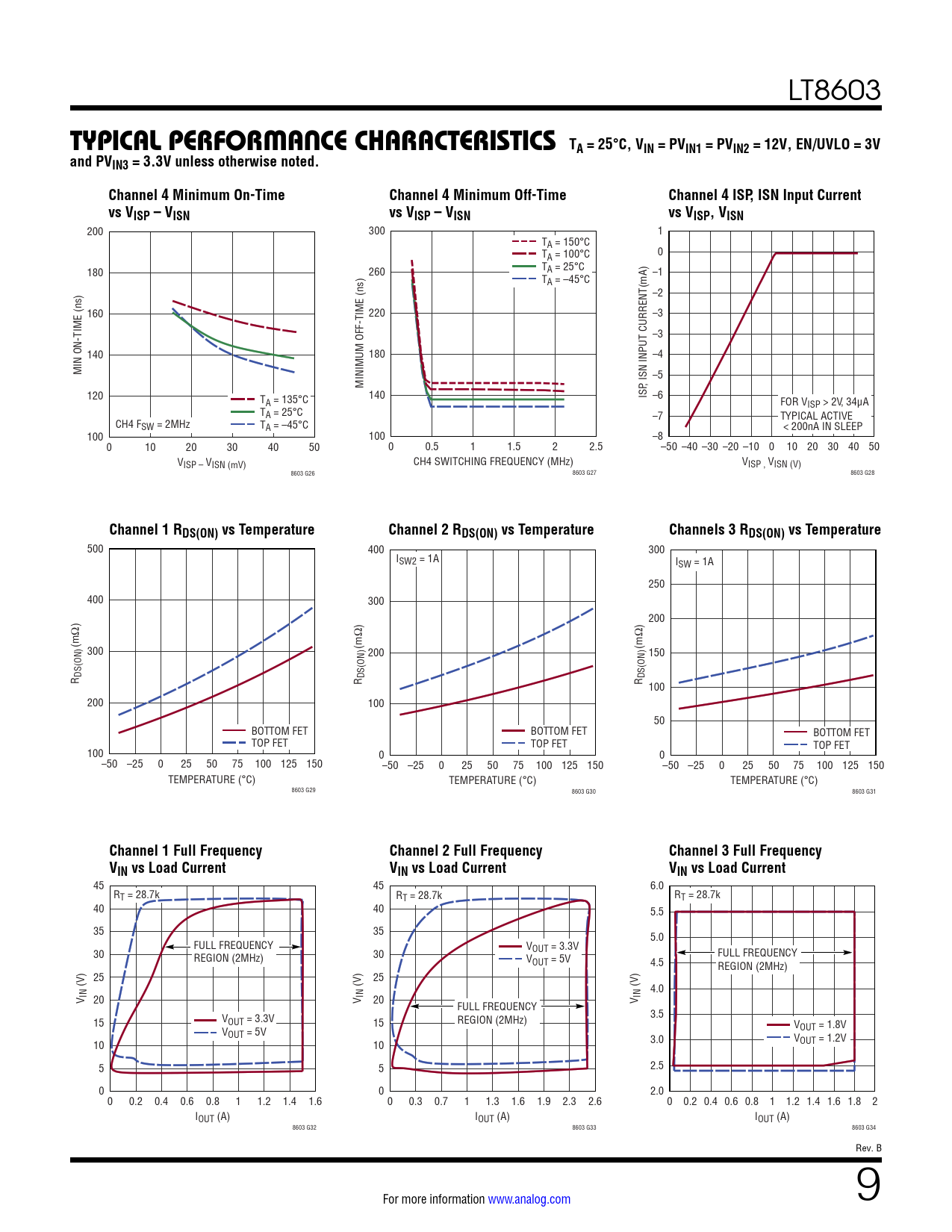 200 300 1 TA = 150°C T 0 A = 100°C 180 TA = 25°C 260 –1 TA = –45°C –2 160 220 –3 –3 140 180 –4 MIN ON-TIME (ns) –5 MINIMUM OFF-TIME (ns) , ISN INPUT CURRENT(mA) 120 T 140 ISP –6 A = 135°C FOR VISP > 2V, 34μA TA = 25°C –7 TYPICAL ACTIVE CH4 FSW = 2MHz TA = –45°C < 200nA IN SLEEP 100 100 –8 0 10 20 30 40 50 0 0.5 1 1.5 2 2.5 –50 –40 –30 –20 –10 0 10 20 30 40 50 VISP – VISN (mV) CH4 SWITCHING FREQUENCY (MHz) VISP , VISN (V) 8603 G26 8603 G27 8603 G28