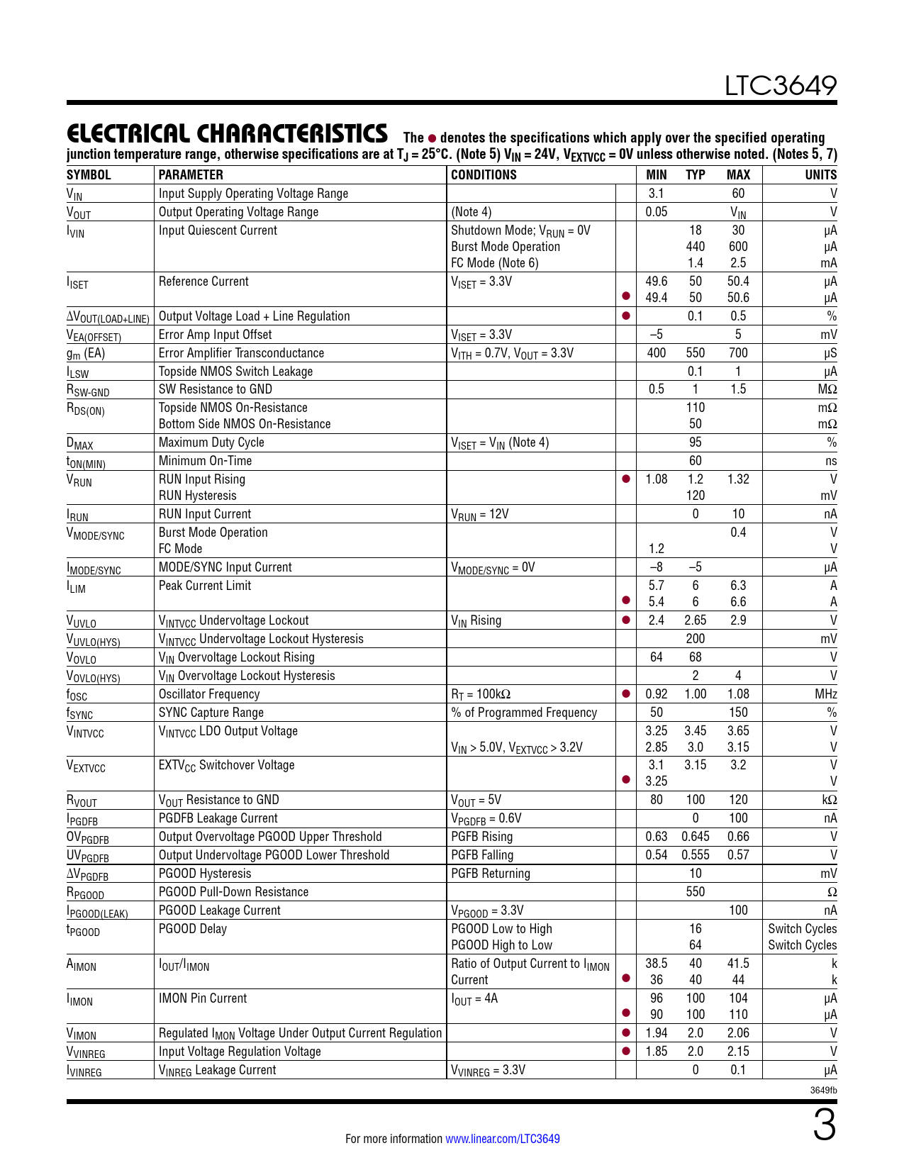 VIN Input Supply Operating Voltage Range 3.1 60 V VOUT Output Operating Voltage Range (Note 4) 0.05 VIN V IVIN Input Quiescent Current Shutdown Mode; VRUN = 0V 18 30 µA Burst Mode Operation 440 600 µA FC Mode (Note 6) 1.4 2.5 mA IISET Reference Current VISET = 3.3V 49.6 50 50.4 µA l 49.4 50 50.6 µA ΔVOUT(LOAD+LINE) Output Voltage Load + Line Regulation l 0.1 0.5 % VEA(OFFSET) Error Amp Input Offset VISET = 3.3V –5 5 mV gm (EA) Error Amplifier Transconductance VITH = 0.7V, VOUT = 3.3V 400 550 700 µS ILSW Topside NMOS Switch Leakage 0.1 1 µA RSW-GND SW Resistance to GND 0.5 1 1.5 MΩ RDS(ON) Topside NMOS On-Resistance 110 mΩ Bottom Side NMOS On-Resistance 50 mΩ DMAX Maximum Duty Cycle VISET = VIN (Note 4) 95 % tON(MIN) Minimum On-Time 60 ns VRUN RUN Input Rising l 1.08 1.2 1.32 V RUN Hysteresis 120 mV IRUN RUN Input Current VRUN = 12V 0 10 nA VMODE/SYNC Burst Mode Operation 0.4 V FC Mode 1.2 V IMODE/SYNC MODE/SYNC Input Current VMODE/SYNC = 0V –8 –5 µA ILIM Peak Current Limit 5.7 6 6.3 A l 5.4 6 6.6 A VUVLO VINTVCC Undervoltage Lockout VIN Rising l 2.4 2.65 2.9 V VUVLO(HYS) VINTVCC Undervoltage Lockout Hysteresis 200 mV VOVLO VIN Overvoltage Lockout Rising 64 68 V VOVLO(HYS) VIN Overvoltage Lockout Hysteresis 2 4 V fOSC Oscillator Frequency RT = 100kΩ l 0.92 1.00 1.08 MHz fSYNC SYNC Capture Range % of Programmed Frequency 50 150 % VINTVCC VINTVCC LDO Output Voltage 3.25 3.45 3.65 V VIN > 5.0V, VEXTVCC > 3.2V 2.85 3.0 3.15 V VEXTVCC EXTVCC Switchover Voltage 3.1 3.15 3.2 V l 3.25 V RVOUT VOUT Resistance to GND VOUT = 5V 80 100 120 kΩ IPGDFB PGDFB Leakage Current VPGDFB = 0.6V 0 100 nA OVPGDFB Output Overvoltage PGOOD Upper Threshold PGFB Rising 0.63 0.645 0.66 V UVPGDFB Output Undervoltage PGOOD Lower Threshold PGFB Falling 0.54 0.555 0.57 V ΔVPGDFB PGOOD Hysteresis PGFB Returning 10 mV RPGOOD PGOOD Pull-Down Resistance 550 Ω IPGOOD(LEAK) PGOOD Leakage Current VPGOOD = 3.3V 100 nA tPGOOD PGOOD Delay PGOOD Low to High 16 Switch Cycles PGOOD High to Low 64 Switch Cycles AIMON IOUT/IIMON Ratio of Output Current to IIMON 38.5 40 41.5 k Current l 36 40 44 k IIMON IMON Pin Current IOUT = 4A 96 100 104 µA l 90 100 110 µA VIMON Regulated IMON Voltage Under Output Current Regulation l 1.94 2.0 2.06 V VVINREG Input Voltage Regulation Voltage l 1.85 2.0 2.15 V IVINREG VINREG Leakage Current VVINREG = 3.3V 0 0.1 µA 3649fb For more information www.linear.com/LTC3649 3 Document Outline Features Applications Description Typical Application Absolute Maximum Ratings Pin Configuration Order Information Electrical Characteristics Typical Performance Characteristics Pin Functions Functional Diagram Operation Applications Information Typical Applications Package Description Revision History Typical Application Related Parts