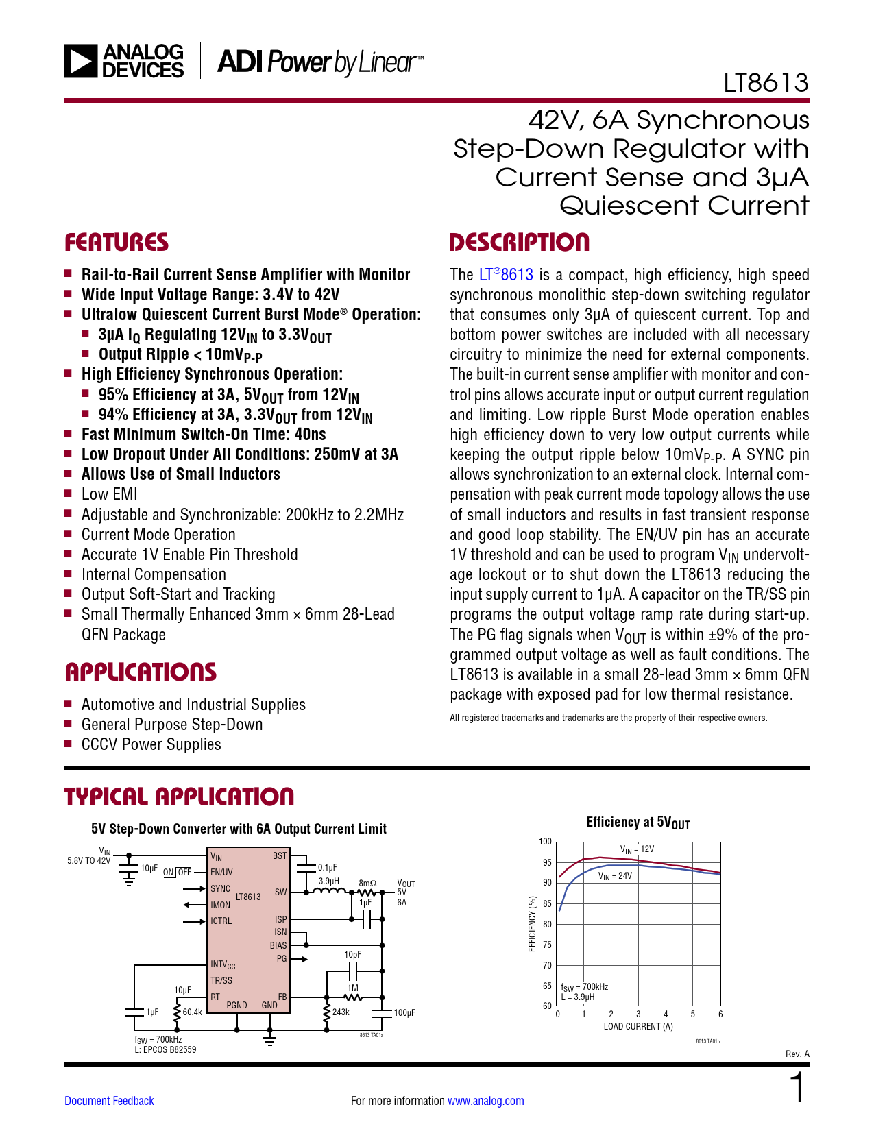 LT8613 42V, 6A Synchronous Step-Down Regulator with Current Sense and 3µA Quiescent Current FEATURESDESCRIPTION n Rail-to-Rail Current Sense Amplifier with Monitor The LT®8613 is a compact, high efficiency, high speed n Wide Input Voltage Range: 3.4V to 42V synchronous monolithic step-down switching regulator n Ultralow Quiescent Current Burst Mode® Operation: that consumes only 3µA of quiescent current. Top and n 3μA IQ Regulating 12VIN to 3.3VOUT bottom power switches are included with all necessary n Output Ripple < 10mVP-P circuitry to minimize the need for external components. n High Efficiency Synchronous Operation: The built-in current sense amplifier with monitor and con- n 95% Efficiency at 3A, 5VOUT from 12VIN trol pins allows accurate input or output current regulation n 94% Efficiency at 3A, 3.3VOUT from 12VIN and limiting. Low ripple Burst Mode operation enables n Fast Minimum Switch-On Time: 40ns high efficiency down to very low output currents while n Low Dropout Under All Conditions: 250mV at 3A keeping the output ripple below 10mVP-P. A SYNC pin n Allows Use of Small Inductors allows synchronization to an external clock. Internal com- n Low EMI pensation with peak current mode topology allows the use n Adjustable and Synchronizable: 200kHz to 2.2MHz of small inductors and results in fast transient response n Current Mode Operation and good loop stability. The EN/UV pin has an accurate n Accurate 1V Enable Pin Threshold 1V threshold and can be used to program VIN undervolt- n Internal Compensation age lockout or to shut down the LT8613 reducing the n Output Soft-Start and Tracking input supply current to 1µA. A capacitor on the TR/SS pin n Small Thermally Enhanced 3mm × 6mm 28-Lead programs the output voltage ramp rate during start-up. QFN Package The PG flag signals when VOUT is within ±9% of the pro- grammed output voltage as well as fault conditions. The APPLICATIONS LT8613 is available in a small 28-lead 3mm × 6mm QFN package with exposed pad for low thermal resistance. n Automotive and Industrial Supplies All registered trademarks and trademarks are the property of their respective owners. n General Purpose Step-Down n CCCV Power Supplies TYPICAL APPLICATION5V Step-Down Converter with 6A Output Current LimitEfficiency at 5VOUT 100 VIN V V IN = 12V IN BST 5.8V TO 42V 10µF 95 ON OFF EN/UV 0.1µF V 3.9µH 8mΩ V 90 IN = 24V SYNC OUT SW LT8613 5V IMON 1µF 6A 85 ICTRL ISP 80 ISN BIAS EFFICIENCY (%) 75 PG 10pF INTVCC 70 TR/SS 10µF 1M 65 fSW = 700kHz RT FB L = 3.9µH PGND GND 60 1µF 60.4k 243k 100µF 0 1 2 3 4 5 6 LOAD CURRENT (A) 8613 TA01a fSW = 700kHz 8613 TA01b L: EPCOS B82559 Rev. A Document Feedback For more information www.analog.com 1 Document Outline Features Applications Typical Application Description Absolute Maximum Ratings Order Information Electrical Characteristics Pin Configuration Typical Performance Characteristics Pin Functions Block Diagram Operation Applications Information Package Description Revision History Typical Application Related Parts