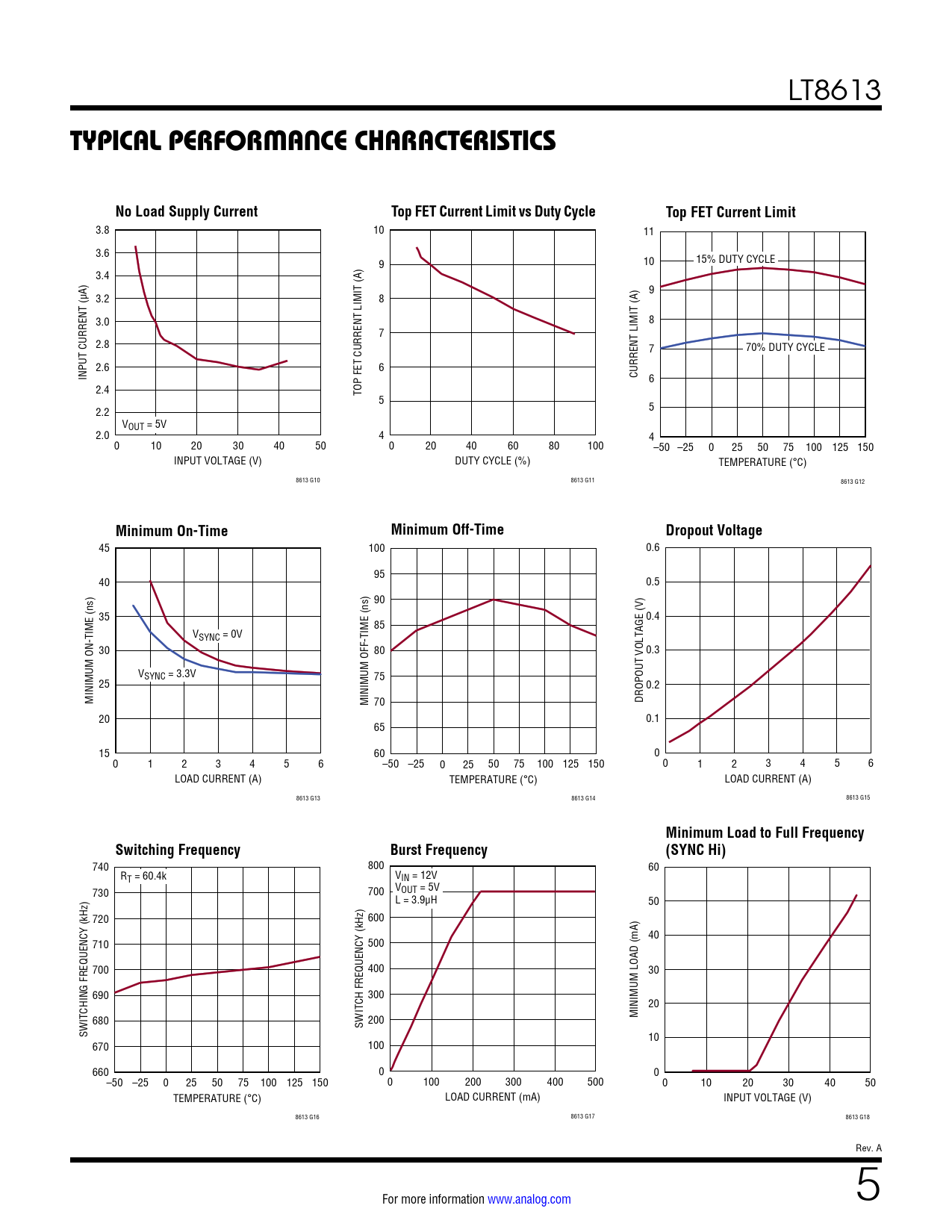 45 100 0.6 95 40 0.5 90 35 0.4 85 VSYNC = 0V 30 80 0.3 VSYNC = 3.3V 75 25 0.2 MINIMUM ON-TIME (ns) MINIMUM OFF-TIME (ns) 70 DROPOUT VOLTAGE (V) 20 0.1 65 15 60 0 0 1 2 3 4 5 6 –50 –25 0 25 50 75 100 125 150 0 1 2 3 4 5 6 LOAD CURRENT (A) TEMPERATURE (°C) LOAD CURRENT (A) 8613 G13 8613 G14 8613 G15