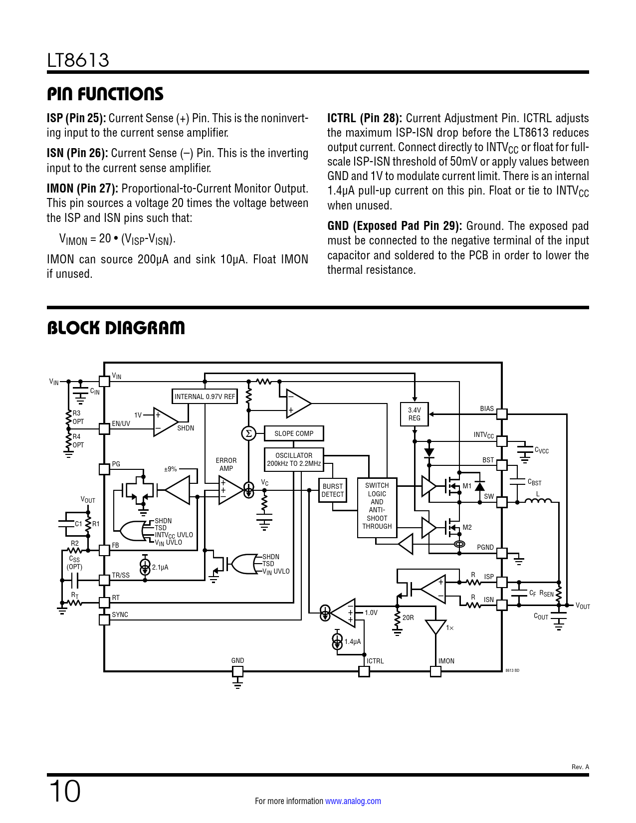 LT8613 PIN FUNCTIONS ISP (Pin 25): Current Sense (+) Pin. This is the noninvert- ICTRL (Pin 28): Current Adjustment Pin. ICTRL adjusts ing input to the current sense amplifier. the maximum ISP-ISN drop before the LT8613 reduces ISN (Pin 26): Current Sense (–) Pin. This is the inverting output current. Connect directly to INTVCC or float for full- input to the current sense amplifier. scale ISP-ISN threshold of 50mV or apply values between GND and 1V to modulate current limit. There is an internal IMON (Pin 27): Proportional-to-Current Monitor Output. 1.4µA pull-up current on this pin. Float or tie to INTVCC This pin sources a voltage 20 times the voltage between when unused. the ISP and ISN pins such that: GND (Exposed Pad Pin 29): Ground. The exposed pad VIMON = 20 • (VISP-VISN). must be connected to the negative terminal of the input IMON can source 200µA and sink 10µA. Float IMON capacitor and soldered to the PCB in order to lower the if unused. thermal resistance. BLOCK DIAGRAM VIN VIN CIN – INTERNAL 0.97V REF + 3.4V BIAS R3 1V + REG OPT EN/UV – SHDN SLOPE COMP INTV R4 CC OPT C OSCILLATOR VCC ERROR PG 200kHz TO 2.2MHz BST ±9% AMP + V C + C BURST SWITCH M1 BST V – DETECT LOGIC SW L OUT AND ANTI- SHOOT SHDN C1 R1 TSD THROUGH M2 INTVCC UVLO R2 VIN UVLO FB PGND C SHDN SS TSD (OPT) 2.1µA VIN UVLO TR/SS R + ISP C R F R T RT – – SEN R ISN + VOUT SYNC + 1.0V 20R COUT 1× 1.4µA GND ICTRL IMON 8613 BD Rev. A 10 For more information www.analog.com Document Outline Features Applications Typical Application Description Absolute Maximum Ratings Order Information Electrical Characteristics Pin Configuration Typical Performance Characteristics Pin Functions Block Diagram Operation Applications Information Package Description Revision History Typical Application Related Parts