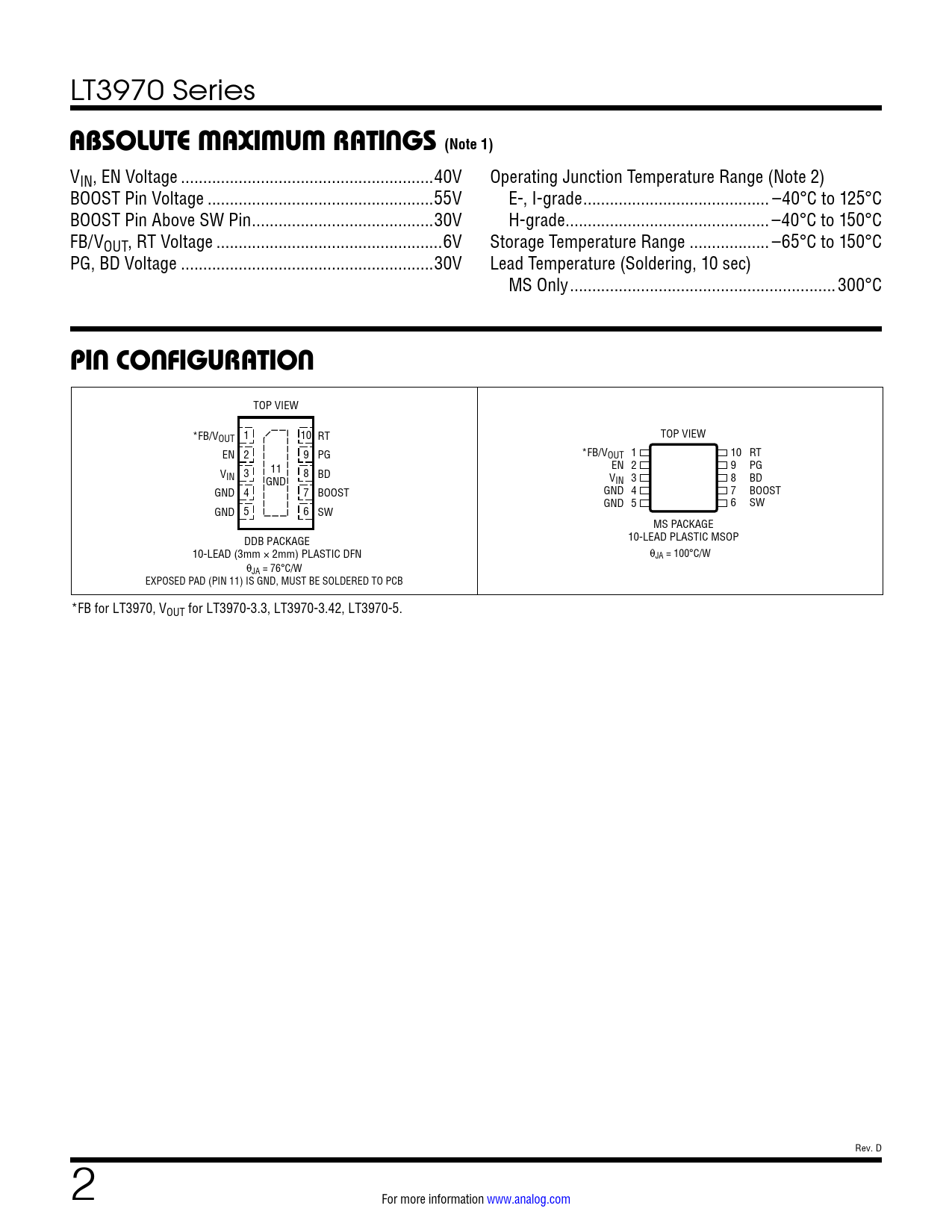 LT3970 Series ABSOLUTE MAXIMUM RATINGS (Note 1) VIN, EN Voltage ...40V Operating Junction Temperature Range (Note 2) BOOST Pin Voltage ...55V E-, I-grade .. –40°C to 125°C BOOST Pin Above SW Pin ...30V H-grade .. –40°C to 150°C FB/VOUT, RT Voltage ...6V Storage Temperature Range .. –65°C to 150°C PG, BD Voltage ...30V Lead Temperature (Soldering, 10 sec) MS Only ..300°C PIN CONFIGURATION TOP VIEW *FB/VOUT 1 10 RT TOP VIEW EN 2 9 PG *FB/VOUT 1 10 RT 11 EN 2 9 PG VIN 3 8 BD GND VIN 3 8 BD GND 4 7 BOOST GND 4 7 BOOST GND 5 6 SW GND 5 6 SW MS PACKAGE DDB PACKAGE 10-LEAD PLASTIC MSOP 10-LEAD (3mm × 2mm) PLASTIC DFN θJA = 100°C/W θJA = 76°C/W EXPOSED PAD (PIN 11) IS GND, MUST BE SOLDERED TO PCB *FB for LT3970, VOUT for LT3970-3.3, LT3970-3.42, LT3970-5. Rev. D 2 For more information www.analog.com Document Outline Features Applications Typical Application Description Absolute Maximum Ratings Pin Configuration Order Information Electrical Characteristics Typical Performance Characteristics Pin Functions Block Diagram Operation Applications Information Typical Applications Package Description Revision History Related Parts