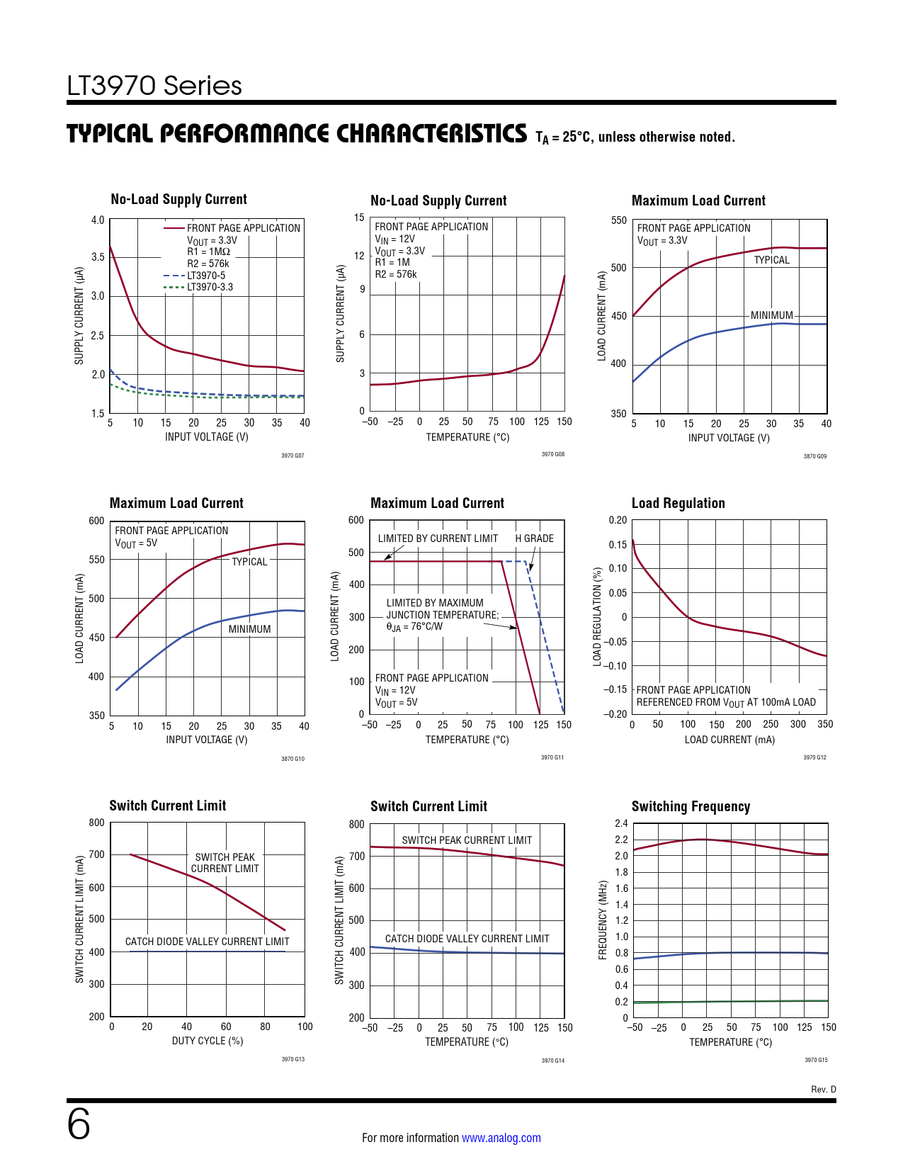 600 600 0.20 FRONT PAGE APPLICATION V LIMITED BY CURRENT LIMIT H GRADE OUT = 5V 0.15 500 550 TYPICAL 0.10 400 500 0.05 LIMITED BY MAXIMUM 300 JUNCTION TEMPERATURE; 0 MINIMUM θJA = 76°C/W 450 –0.05 200 LOAD CURRENT (mA) LOAD CURRENT (mA) LOAD REGULATION (%) –0.10 400 100 FRONT PAGE APPLICATION VIN = 12V –0.15 FRONT PAGE APPLICATION VOUT = 5V REFERENCED FROM VOUT AT 100mA LOAD 350 0 –0.20 5 10 15 20 25 30 35 40 –50 –25 0 25 50 75 100 125 150 0 50 100 150 200 250 300 350 INPUT VOLTAGE (V) TEMPERATURE (°C) LOAD CURRENT (mA) 3870 G10 3970 G11 3970 G12